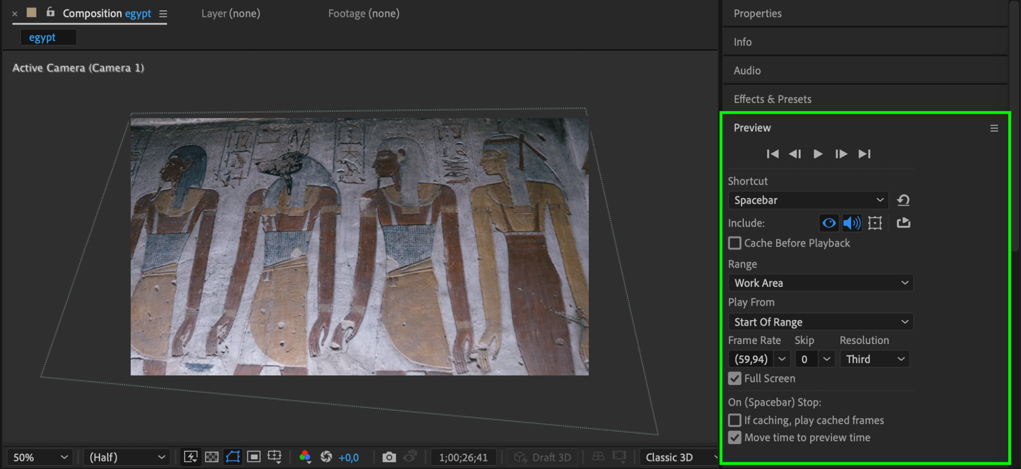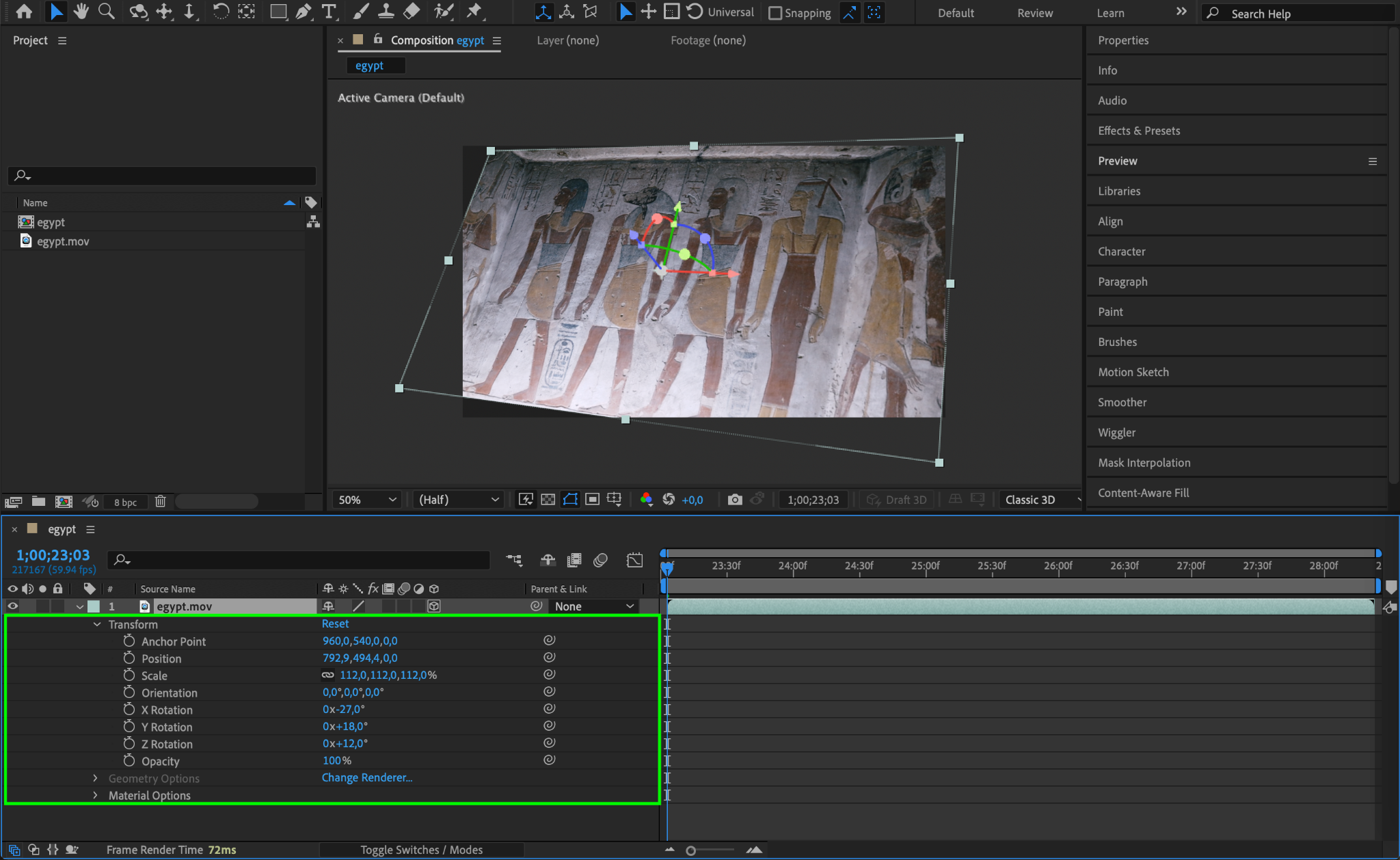 Press the spacebar to play your composition and review the adjustments. Pay attention to how the perspective shifts and how the video interacts with the 3D space. This step allows you to fine-tune any final details before moving on to the export process.