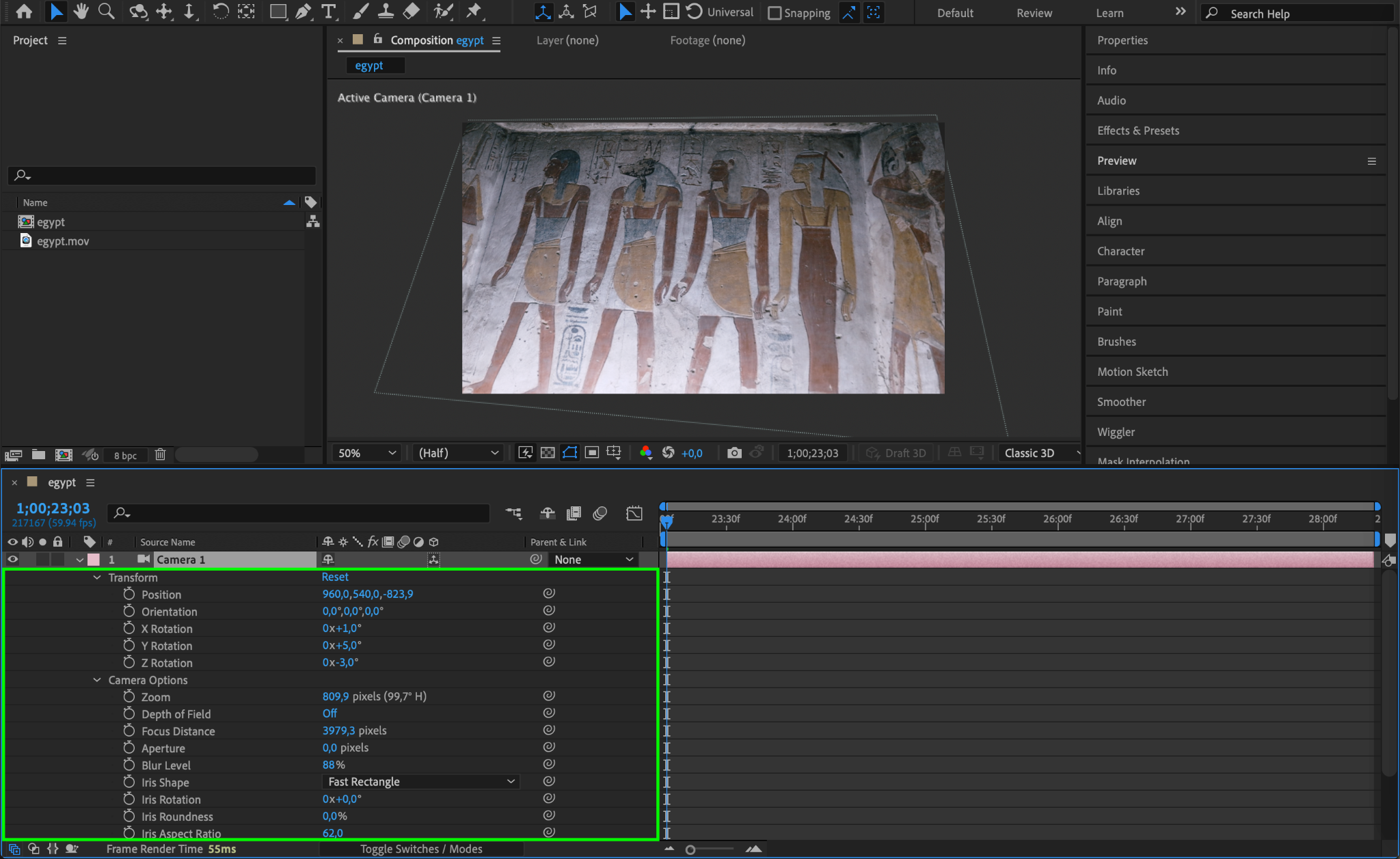 Go to “Layer” > “New” > “Camera” to create a camera layer. Once added, use the Camera Tool to adjust the camera angle and focal length, which will change how the video appears within the 3D space. The camera layer allows you to create more dynamic movements, like zooming or panning, to make your perspective shift more engaging. This tool is great for adding realism and depth to your scene.