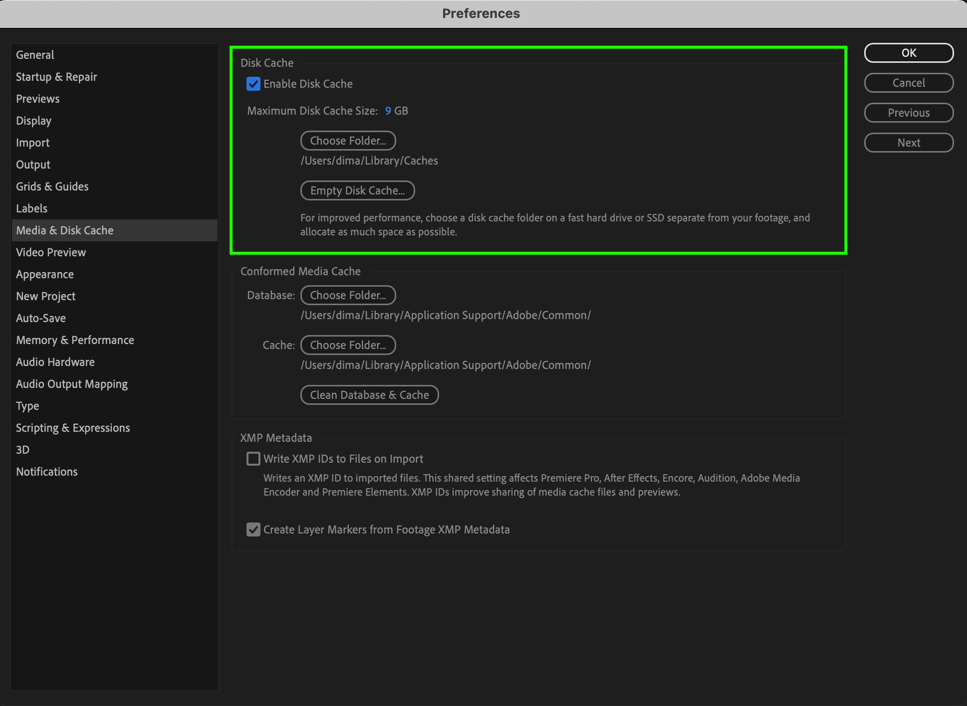 In the Preferences window, go to the Disk Cache section. Here, you’ll see the current location of your disk cache folder and details about its size and usage. This is where After Effects temporarily stores files to optimize performance.