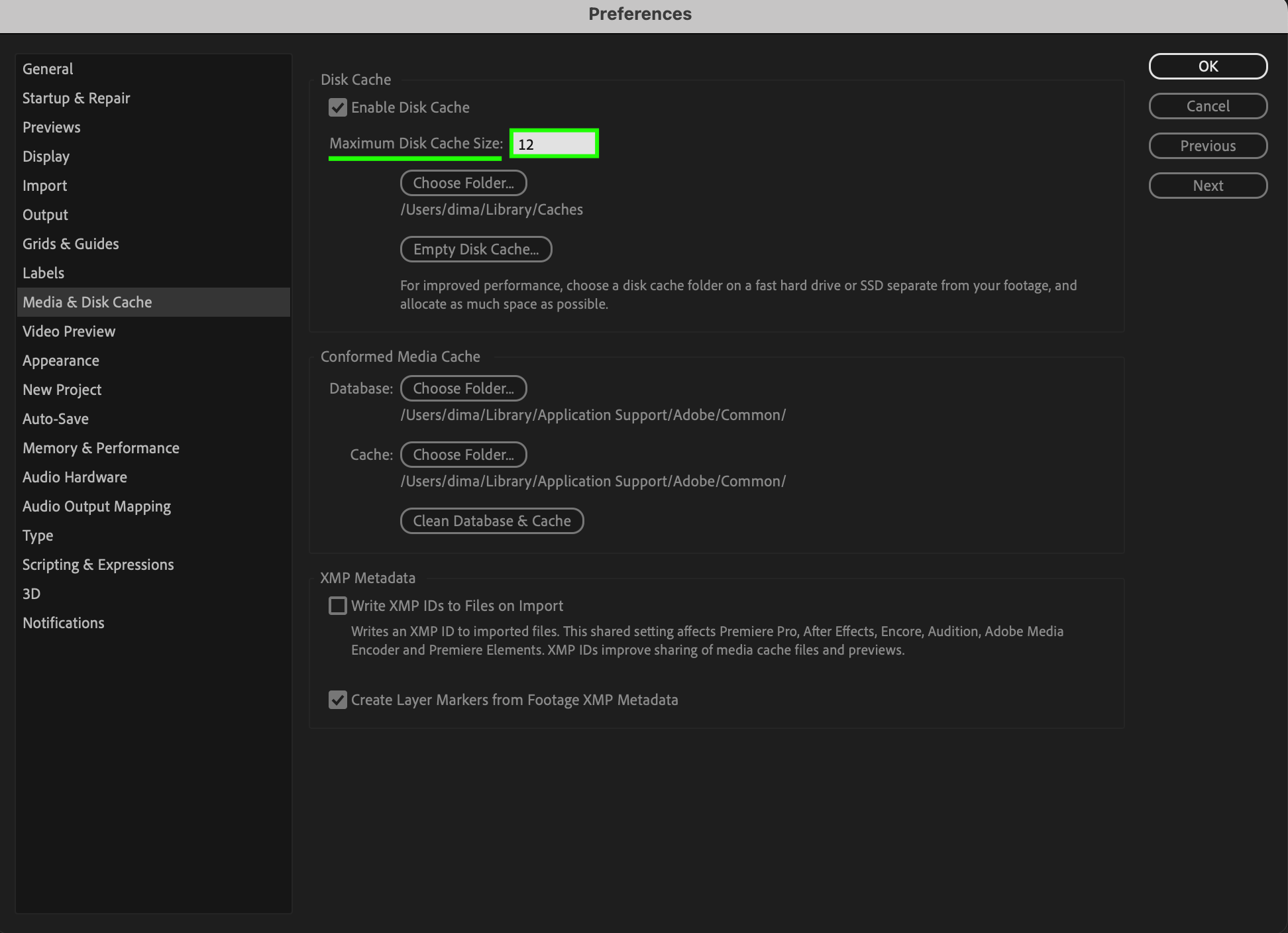 Start by opening After Effects and navigating to Edit > Preferences > Media & Disk Cache on Windows or After Effects > Settings > Media & Disk Cache on macOS. This menu allows you to access settings related to disk caching and temporary files.