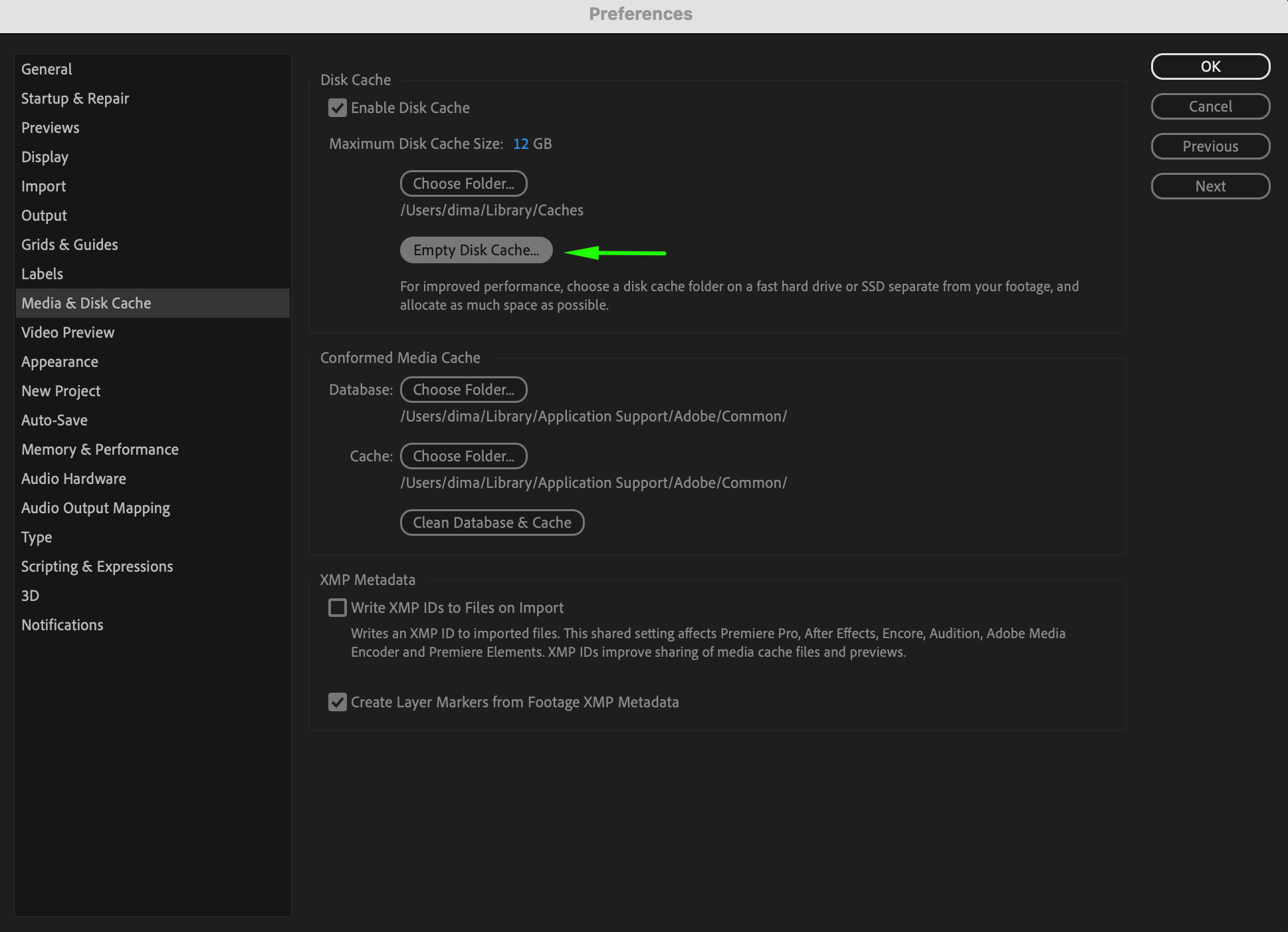 If you want to free up space on your previous scratch disk, you can clear the old disk cache. Click the Empty Disk Cache button in the same preferences window. This will delete temporary files stored in the old location, freeing up space without affecting your projects.