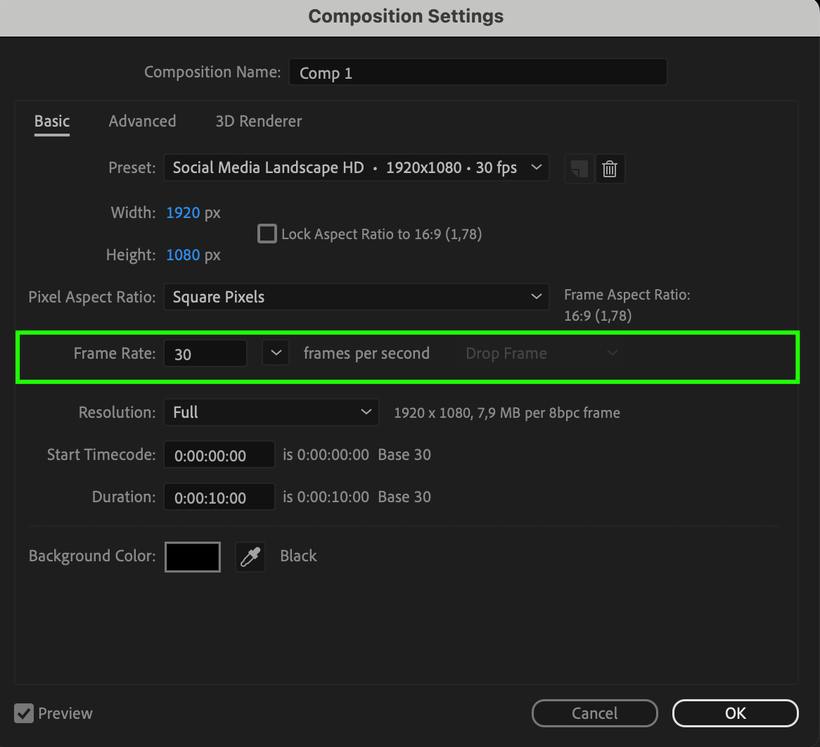 In the Composition Settings window, you’ll see several tabs and fields. Look for the Frame Rate field, usually found under the Basic Settings section. This is where the current framerate of your composition is displayed and can be edited.