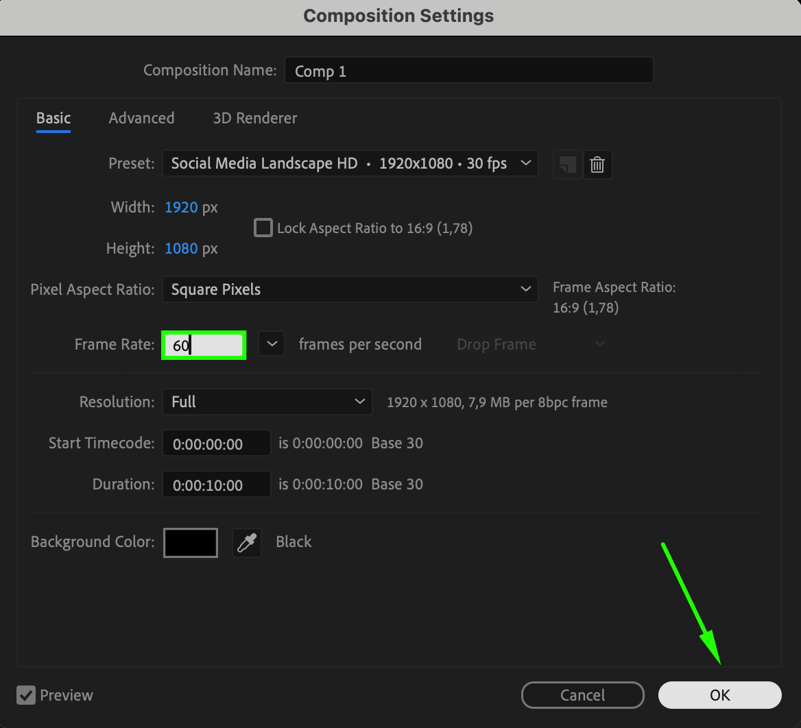 Decide on the framerate that fits your project’s needs and enter it into the Frame Rate field. For cinematic effects, you can set it to 24 fps. If you’re creating online videos, 30 fps is a good standard. For smoother animations, 60 fps or higher is commonly used. Once you’ve made your changes, click OK to save and apply them.