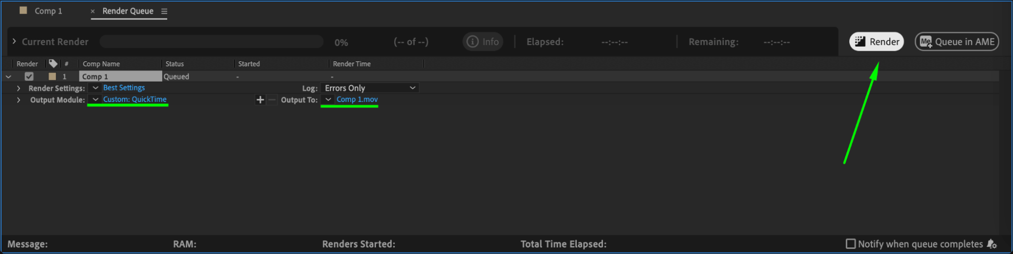When you’re ready to export your composition, go to Composition > Add to Render Queue. In the Render Settings, select your output format and destination, then click Render to complete the process.