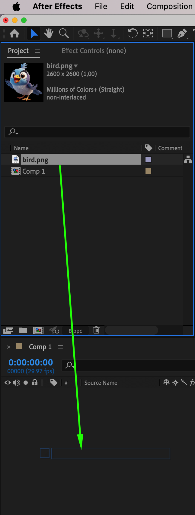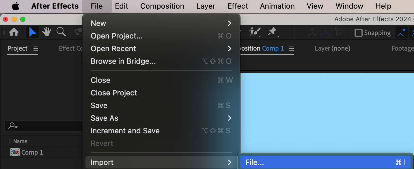 Go to File > Import > File, select the PNG image you want to stretch, and drag it into the timeline. This adds the image as a layer inside your composition.