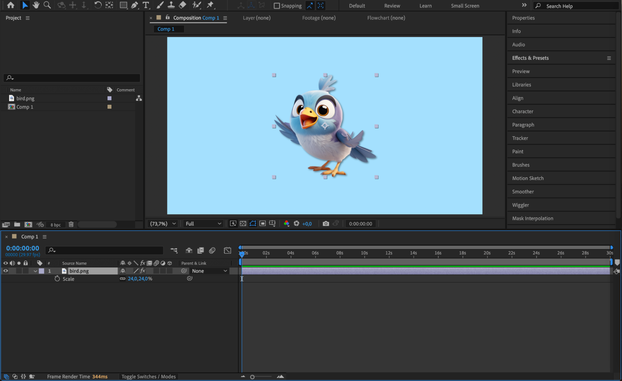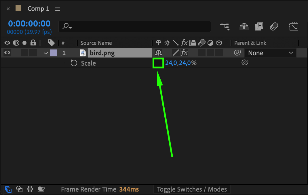 With the image layer selected, press “S” on your keyboard to reveal the Scale property. By default, scale values are linked together, meaning height and width scale uniformly.