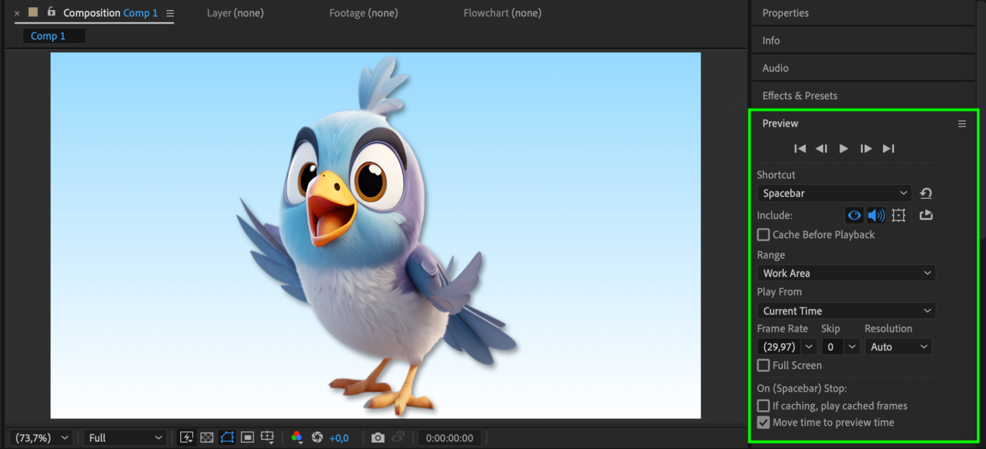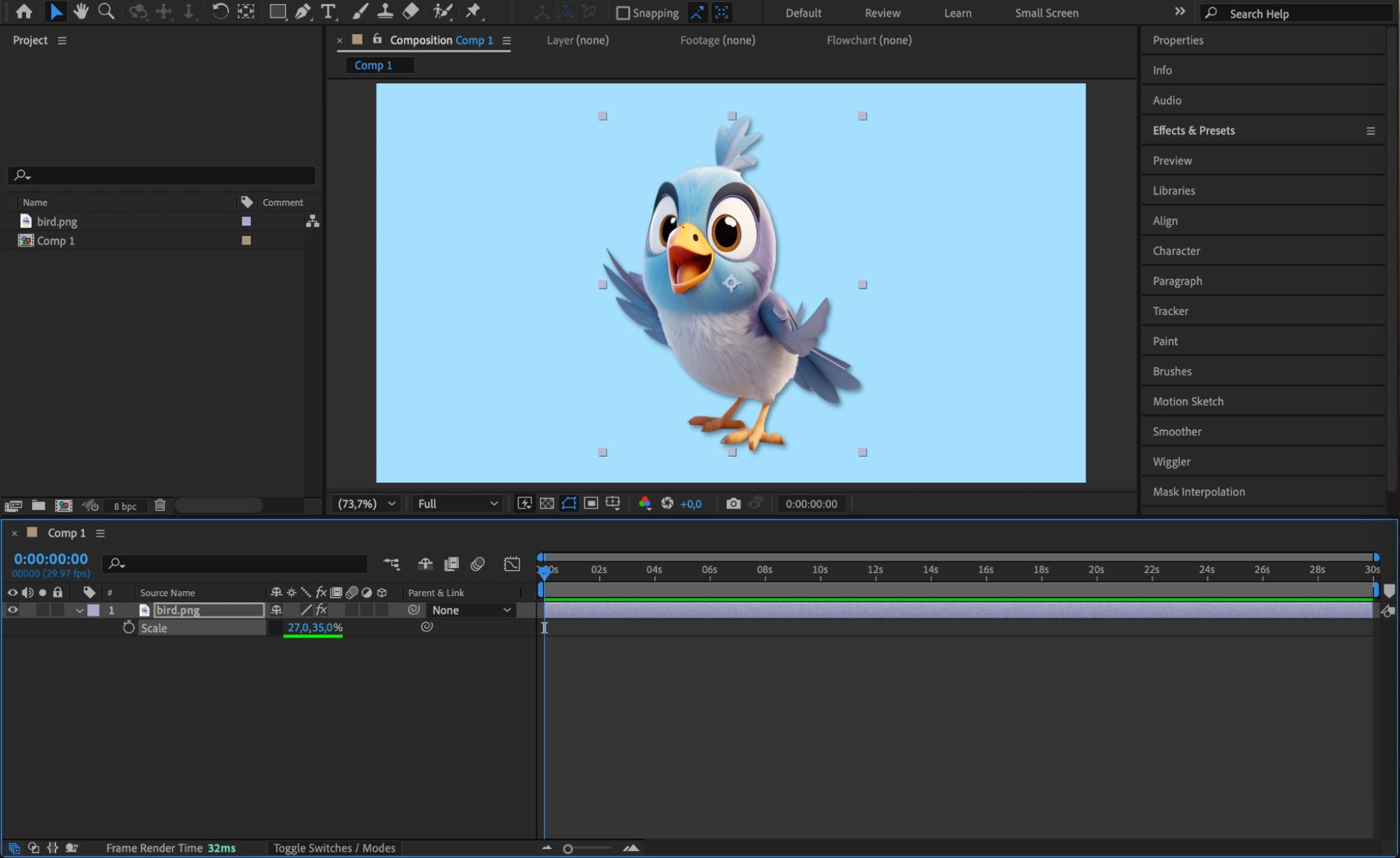 Press the spacebar to preview your animation or layout. If the object doesn’t look right, go back and tweak the scale and anchor point. Continue until the height and proportions match your design needs.