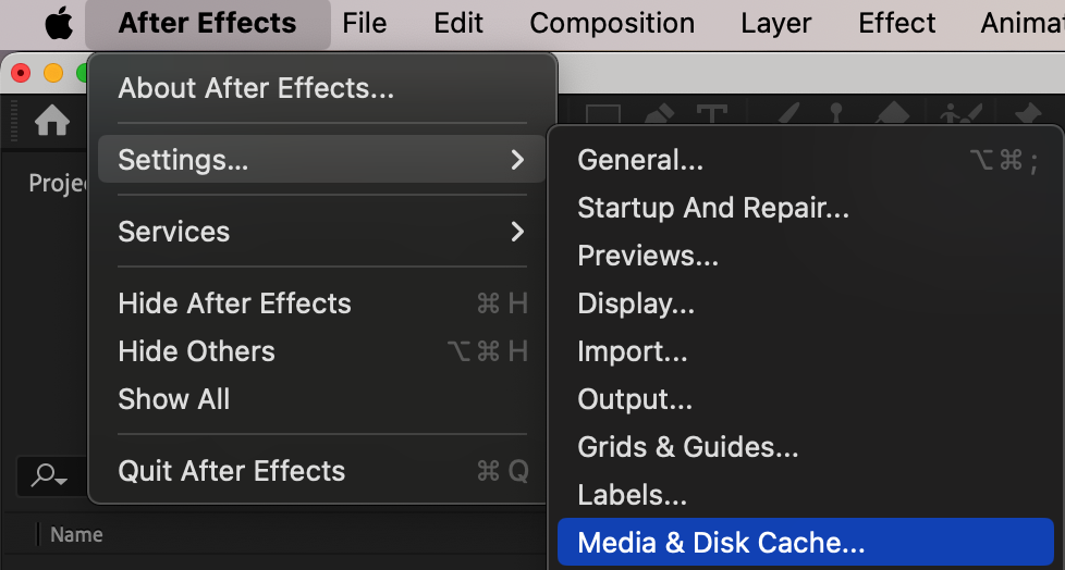 Start by opening After Effects and navigating to Edit > Preferences > Media & Disk Cache on Windows or After Effects > Settings > Media & Disk Cache on macOS. This menu allows you to access settings related to disk caching and temporary files.