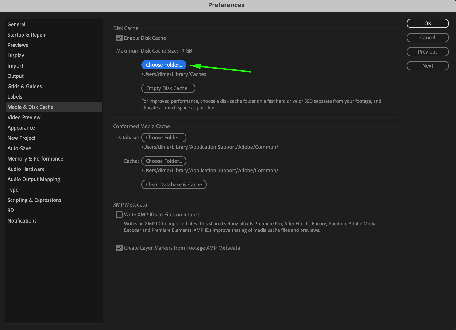 Click the Choose Folder button next to the disk cache location. Select a folder on a different drive with sufficient free space. Ideally, choose an SSD or a fast external drive for better performance. Avoid using system or OS drives if possible, as this can slow down your computer.
