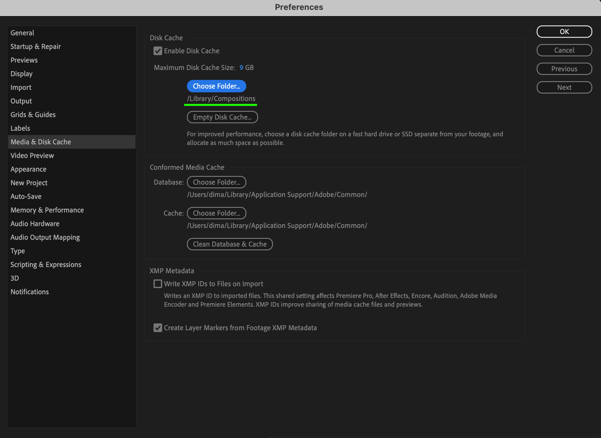 In the Preferences window, go to the Disk Cache section. Here, you’ll see the current location of your disk cache folder and details about its size and usage. This is where After Effects temporarily stores files to optimize performance.