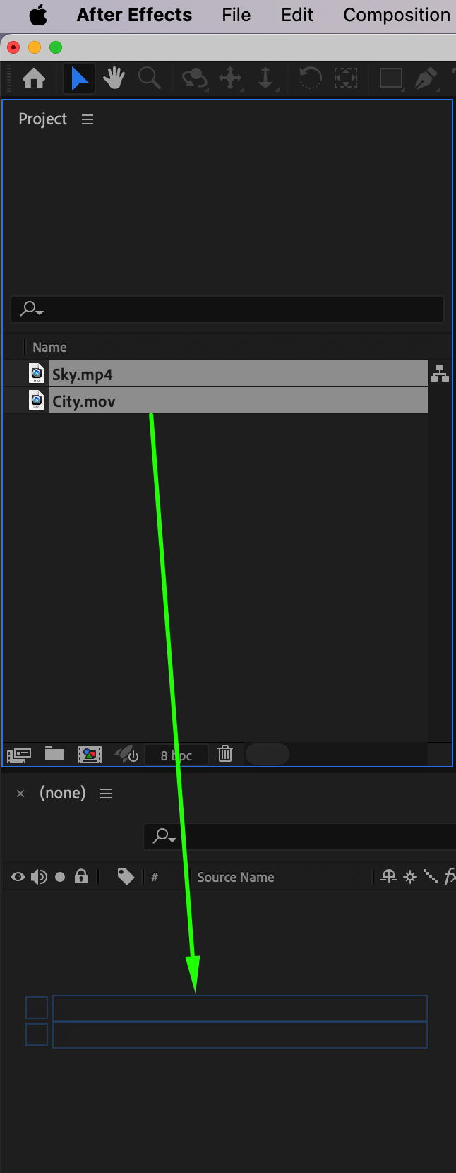 Import two video files: the main footage with the sky you want to replace and the replacement sky footage. Drag both files onto the timeline, placing the main footage above the replacement sky layer.