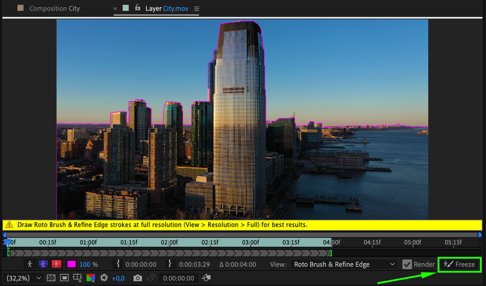 Once satisfied, go to the bottom of the Composition panel and click Freeze to lock the roto selection. This ensures the separation remains consistent throughout the clip.