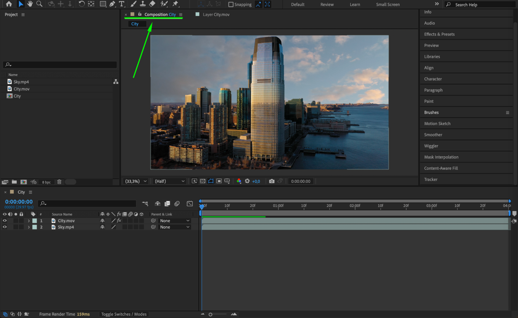 Return to the Composition panel and adjust the sky layer. Scale and position the sky footage to fit the composition. If necessary, reduce the opacity slightly to blend it naturally with the scene.