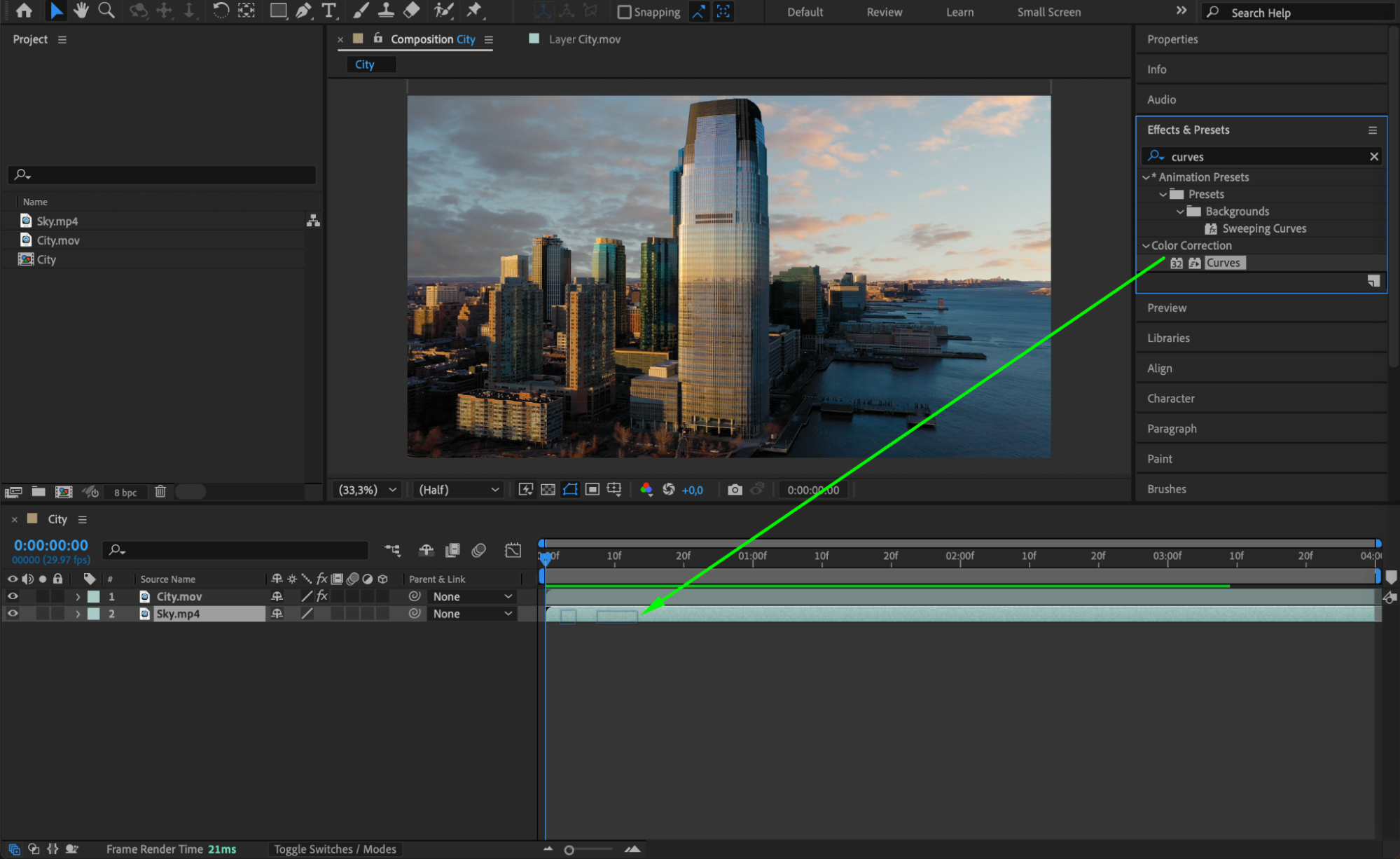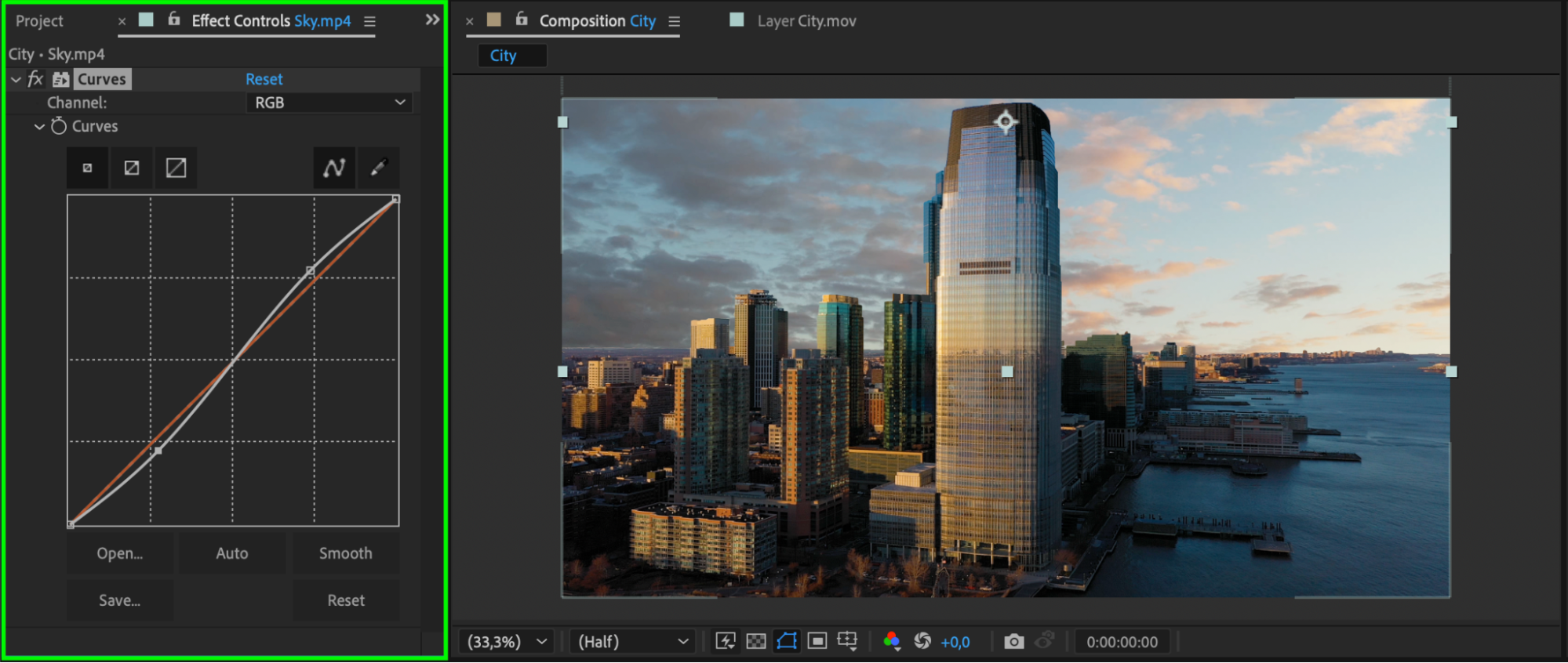 Add the Curves effect to the sky layer. Create an S-shaped curve to enhance contrast and make the colors pop. Adjust the curves to match the mood and lighting of your main footage.