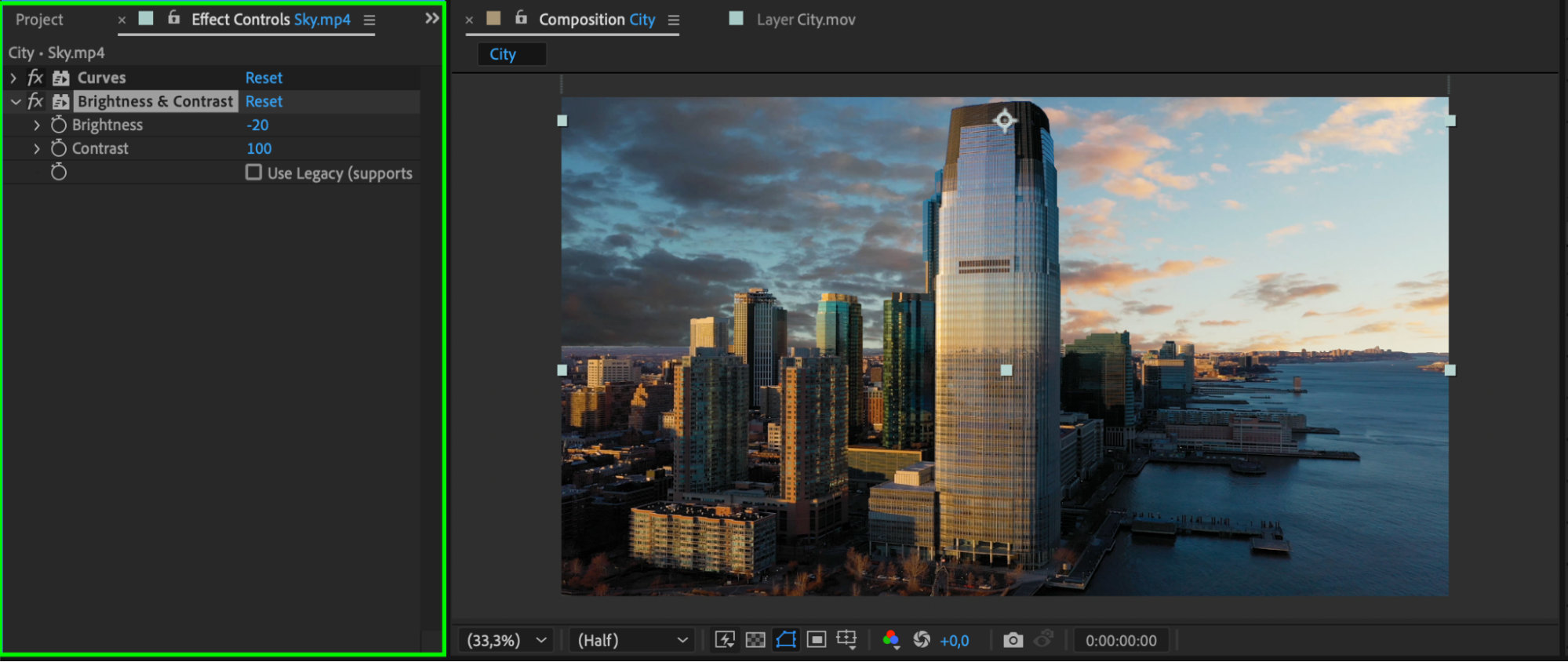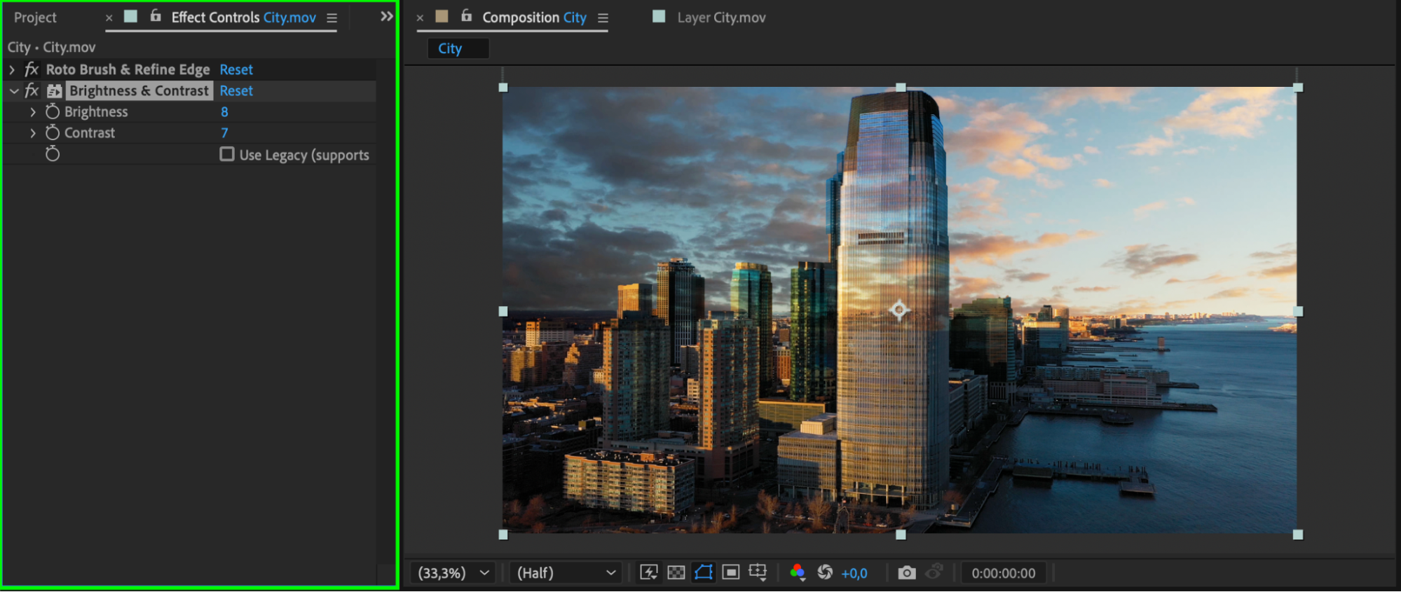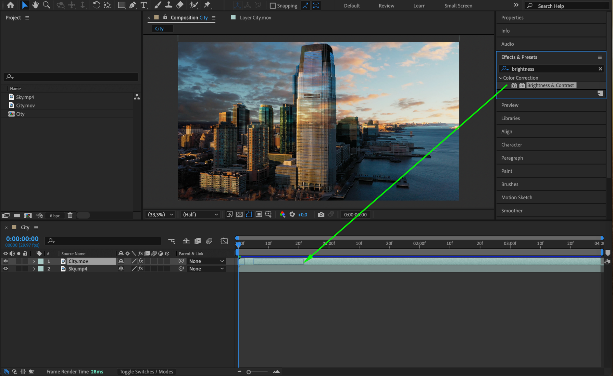 Apply the Brightness & Contrast effect to the foreground layer as well. Adjust the settings to ensure the lighting and colors align with the new sky, creating a consistent and realistic look.
