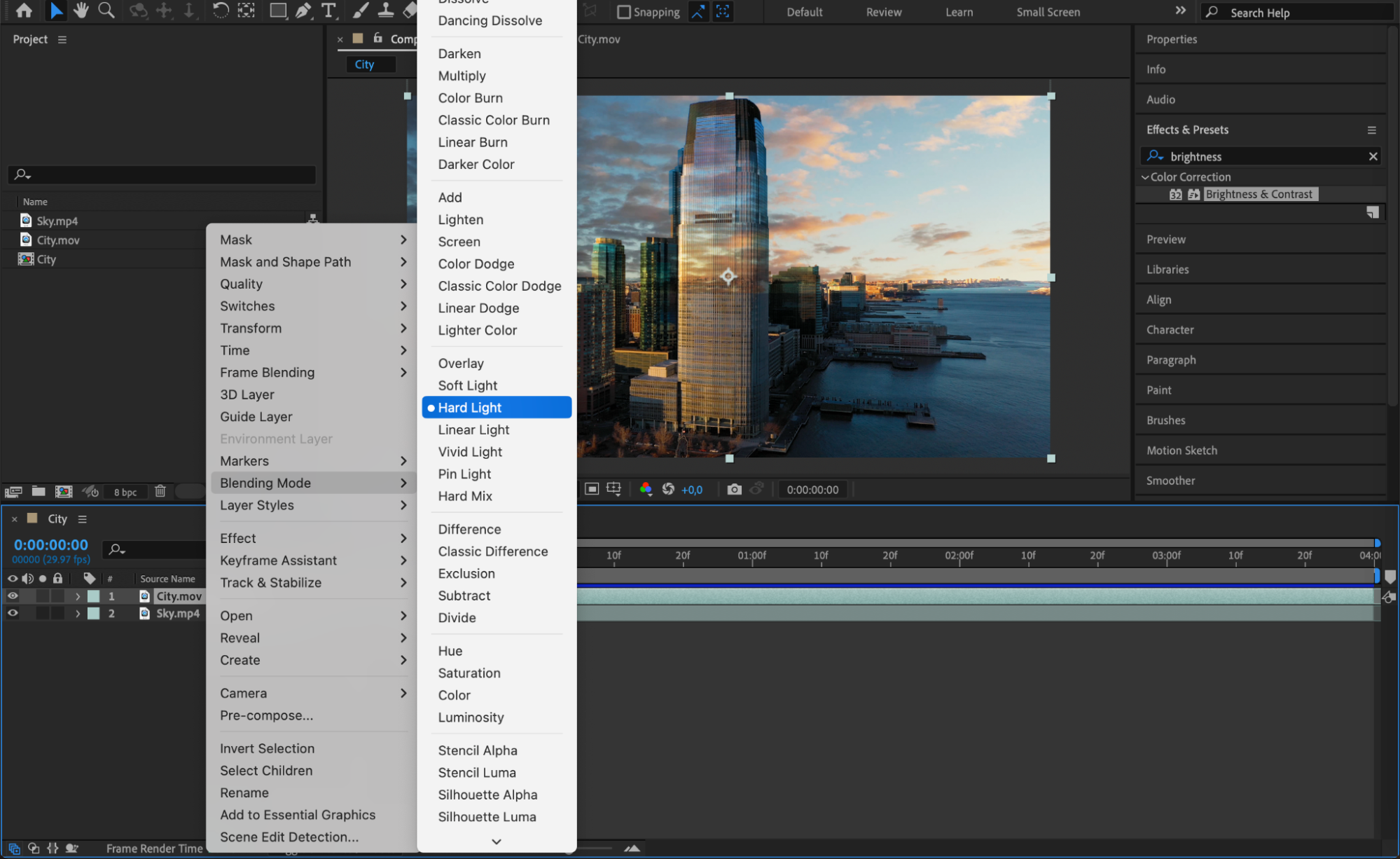 Set the foreground layer’s Blending Mode to Hard Light (or another mode that works for your scene). This helps the two layers integrate better by enhancing their interaction.