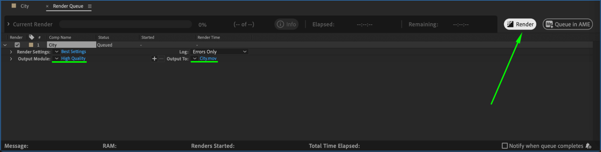 When satisfied with the result, render the project. Go to Composition > Add to Render Queue, select your preferred format (e.g., H.264 for video), and click Render.