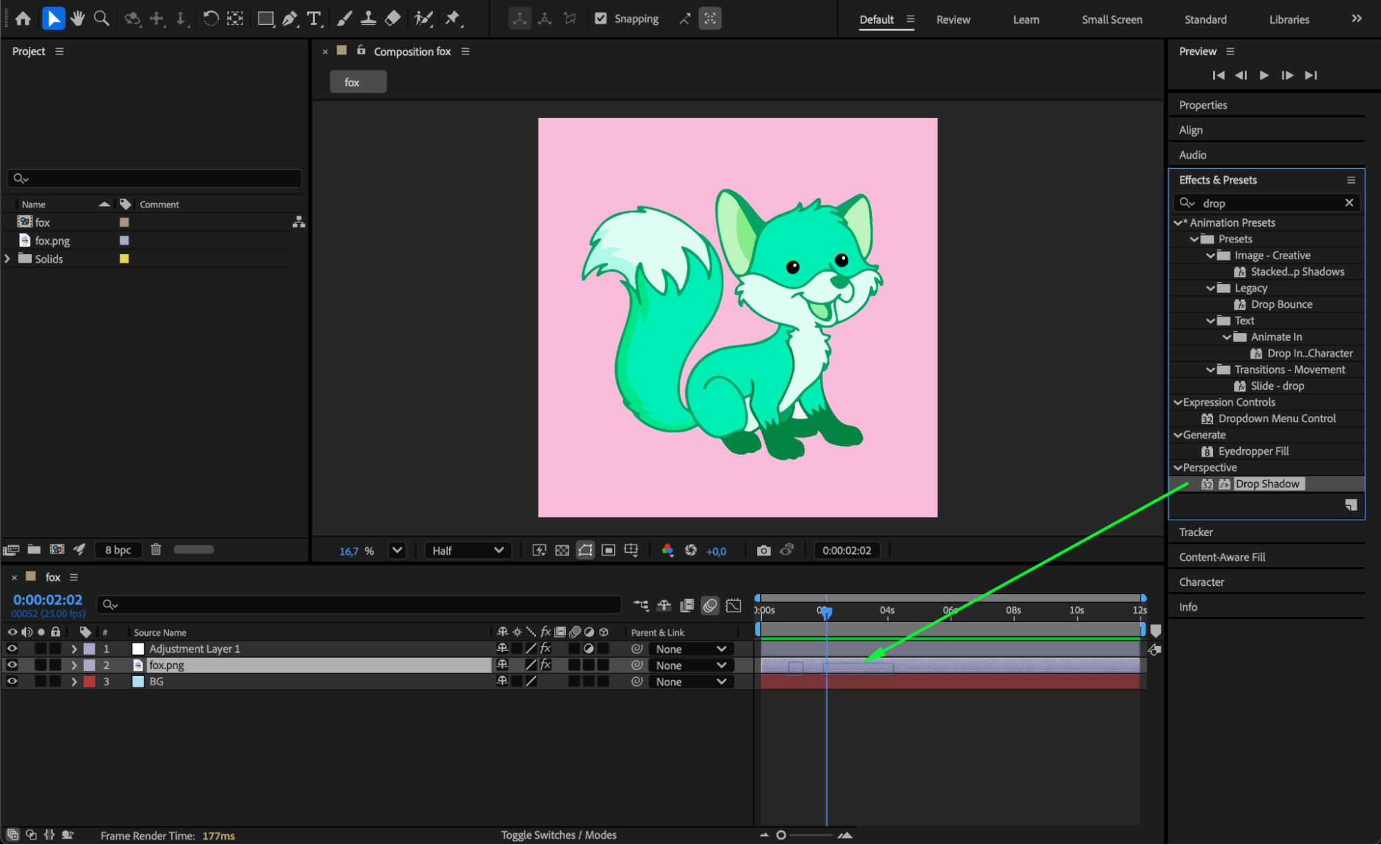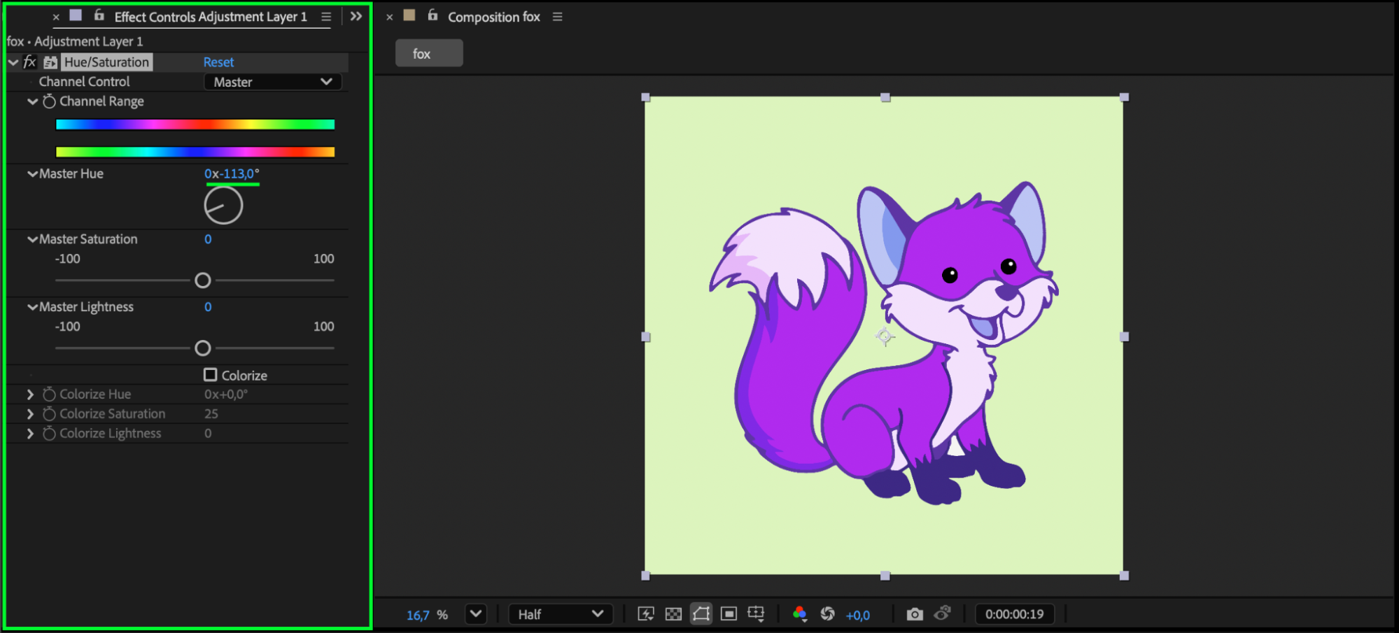 Open the Effects & Presets panel and search for Hue/Saturation. Drag the effect onto the adjustment layer. This effect will let you shift and modify the overall color palette of your animation.