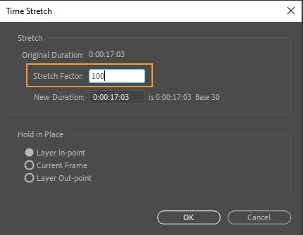 – In the Time Stretch dialog box, adjust the “Stretch Factor” to accelerate or decelerate your footage’s speed.