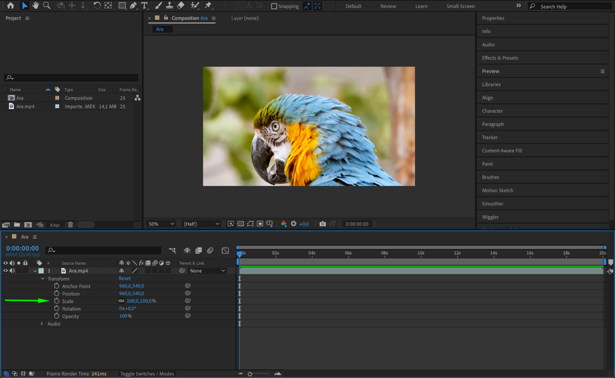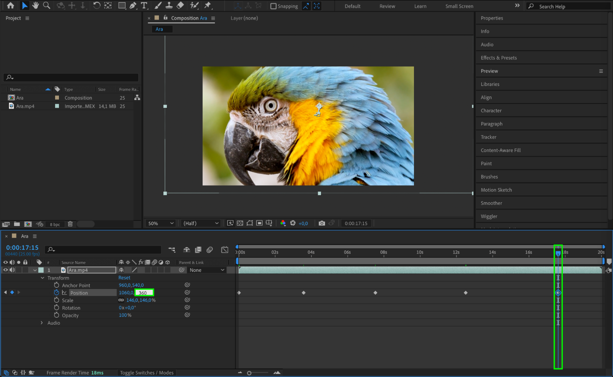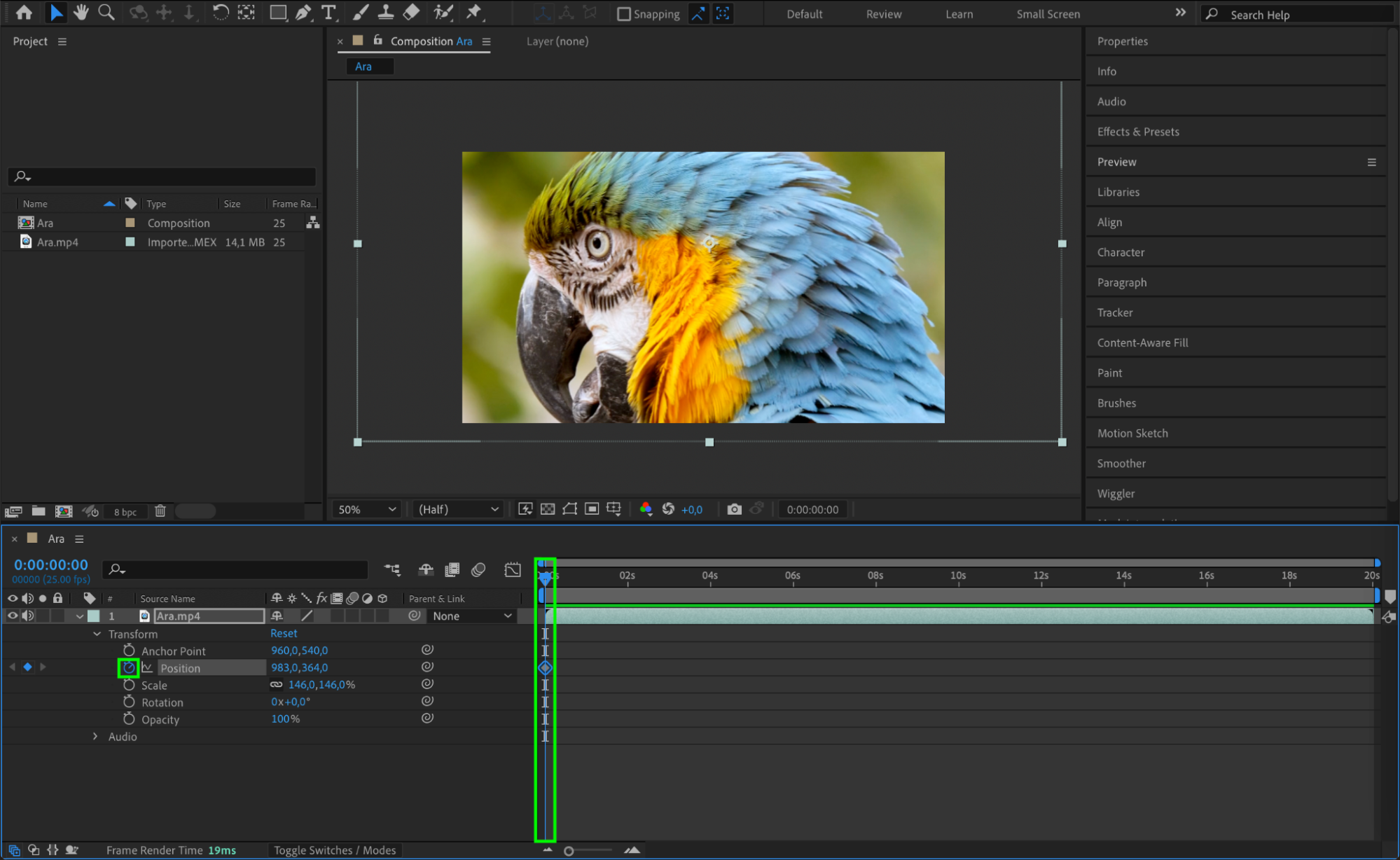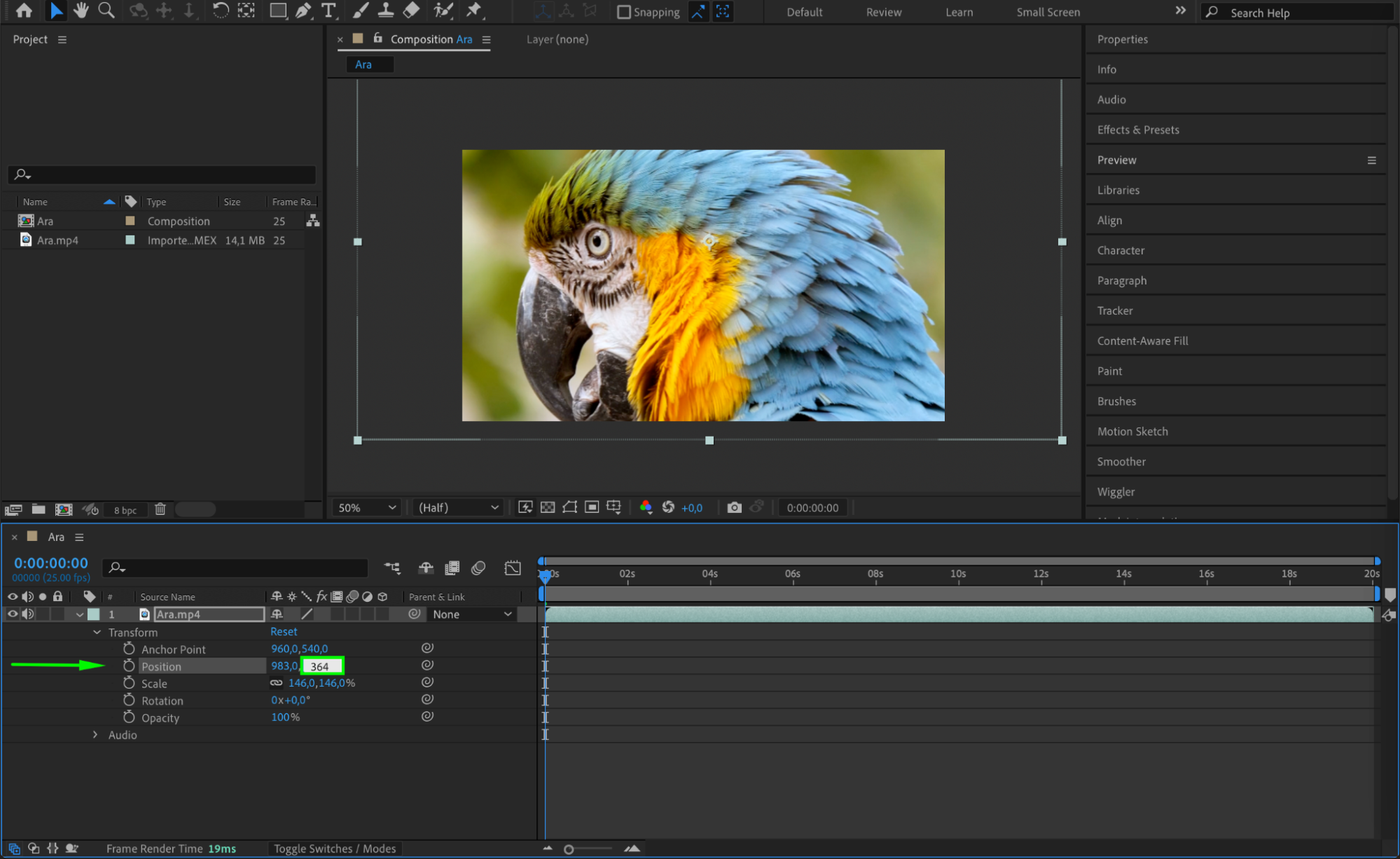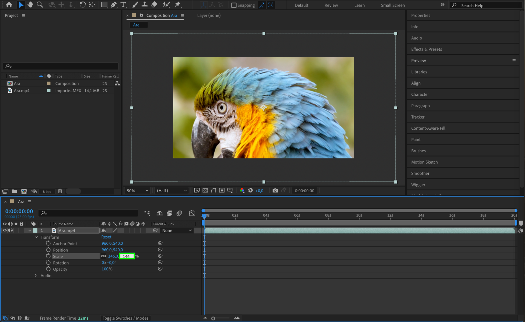 Position Adjustment: Use the Position property (press P to open) to ensure that the desired part of the video remains in view. If necessary, add keyframes to animate the scale or position changes over time.