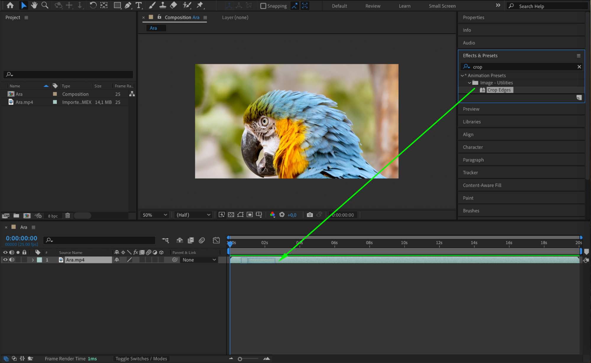 Apply Crop Effect: Navigate to the Effects & Presets panel and find the Crop effect. Drag it onto the video layer you want to adjust.