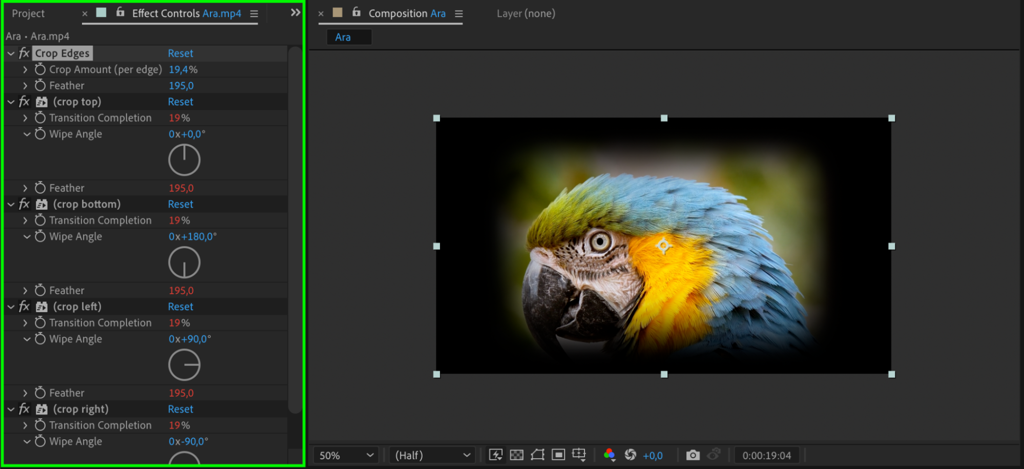 Adjust Crop Parameters: In the Effect Controls panel, use the crop settings (Top, Bottom, Left, Right) to trim the video’s edges. This method is useful for removing unwanted areas of the video without affecting the entire composition.