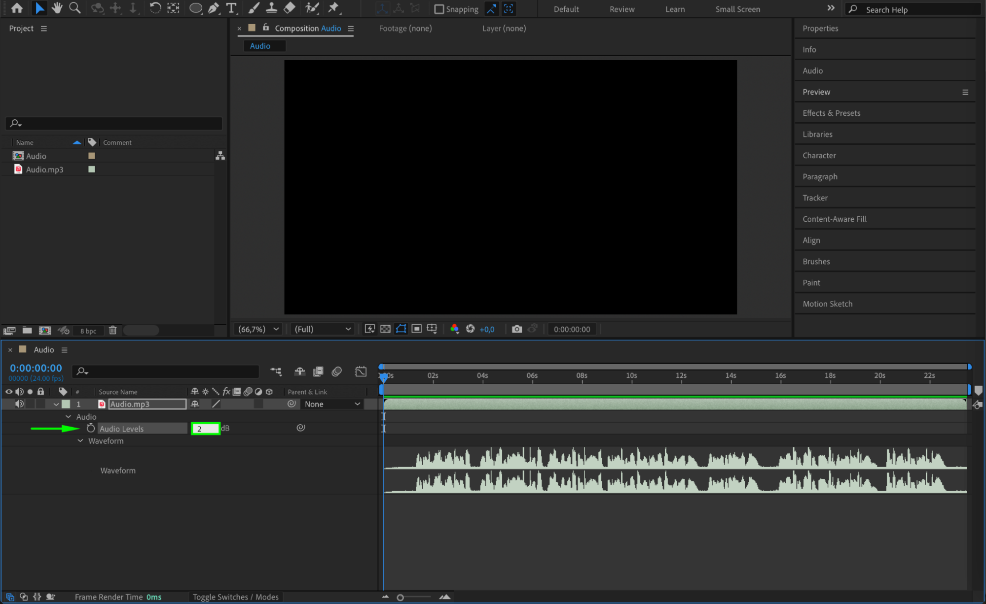 Click the dropdown arrow next to your audio layer to reveal its properties. Expand the Audio Levels (L) and Waveforms (LL) to see the sound visualization and adjust volume if needed.
