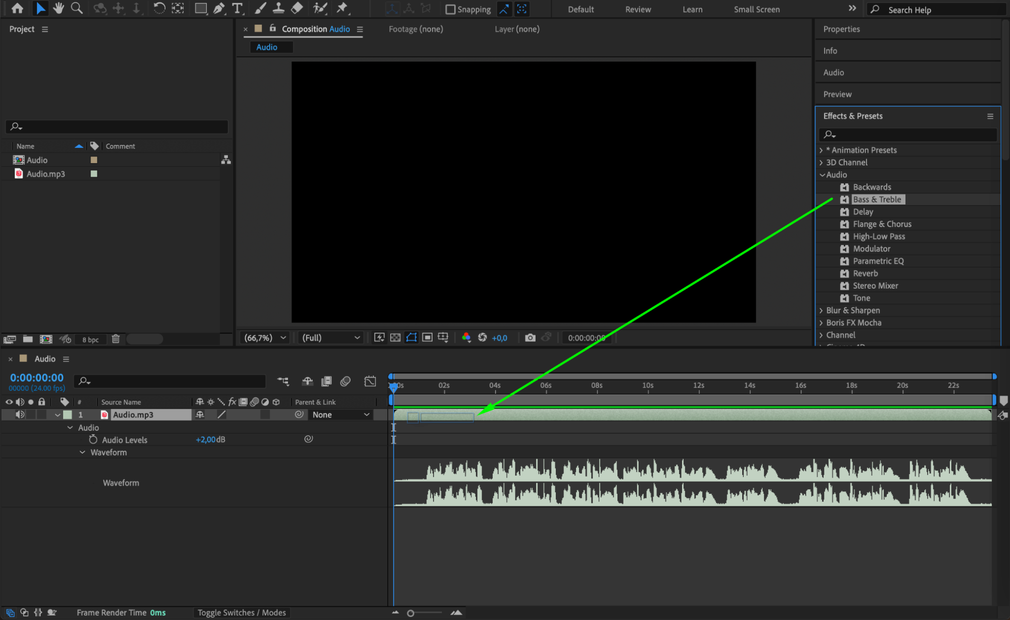 Go to Effects & Presets, search for Bass & Treble or Flange & Chorus, and drag them onto your audio layer. Then, open the Effect Controls panel to fine-tune these effects for a deeper or robotic voice.