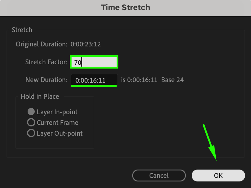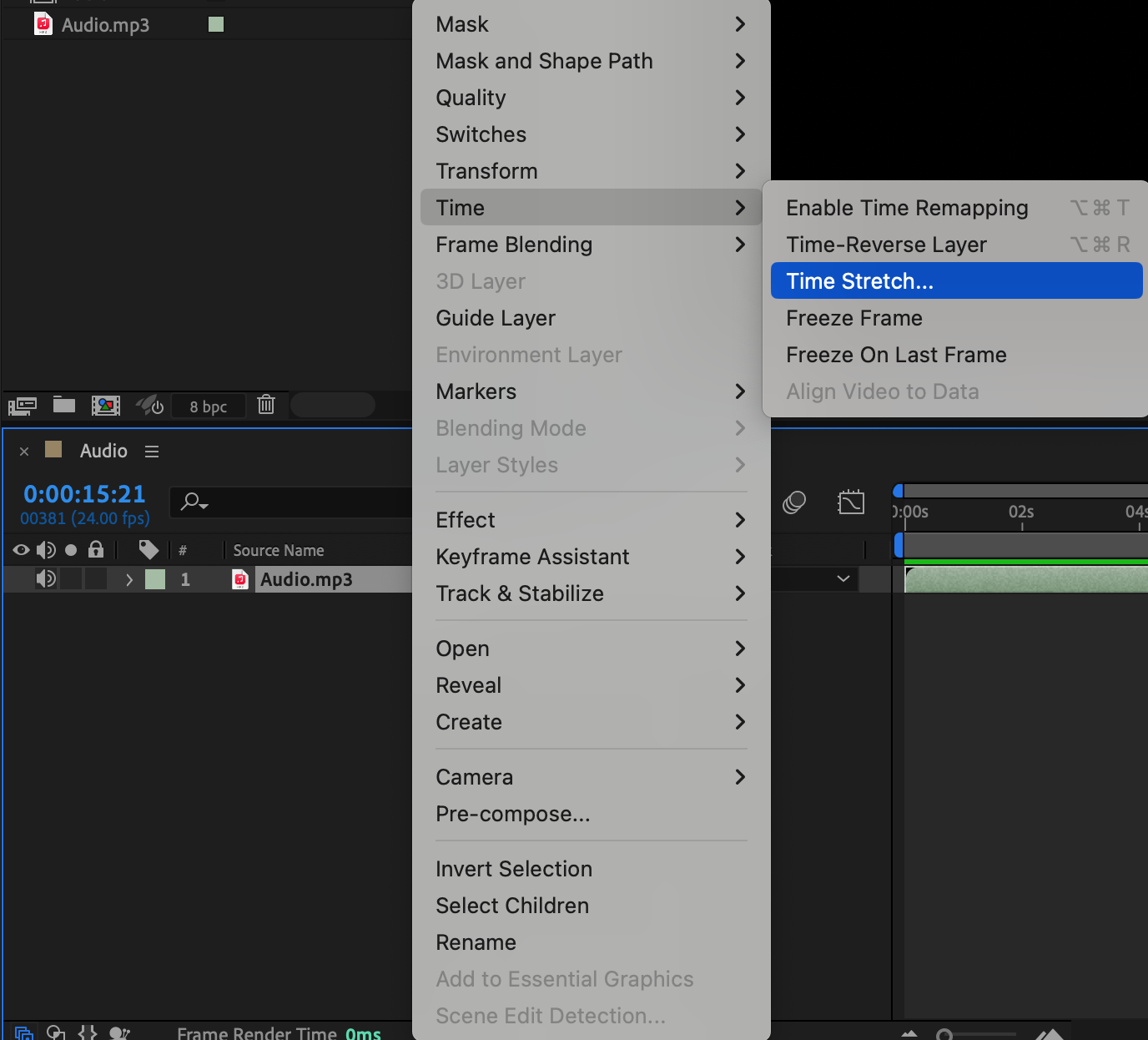 Right-click on the audio layer, select Time > Time Stretch, and adjust the Stretch Factor. For example, setting it to 70 speeds up the audio and raises the pitch, while increasing it slows down the voice for a deeper tone.