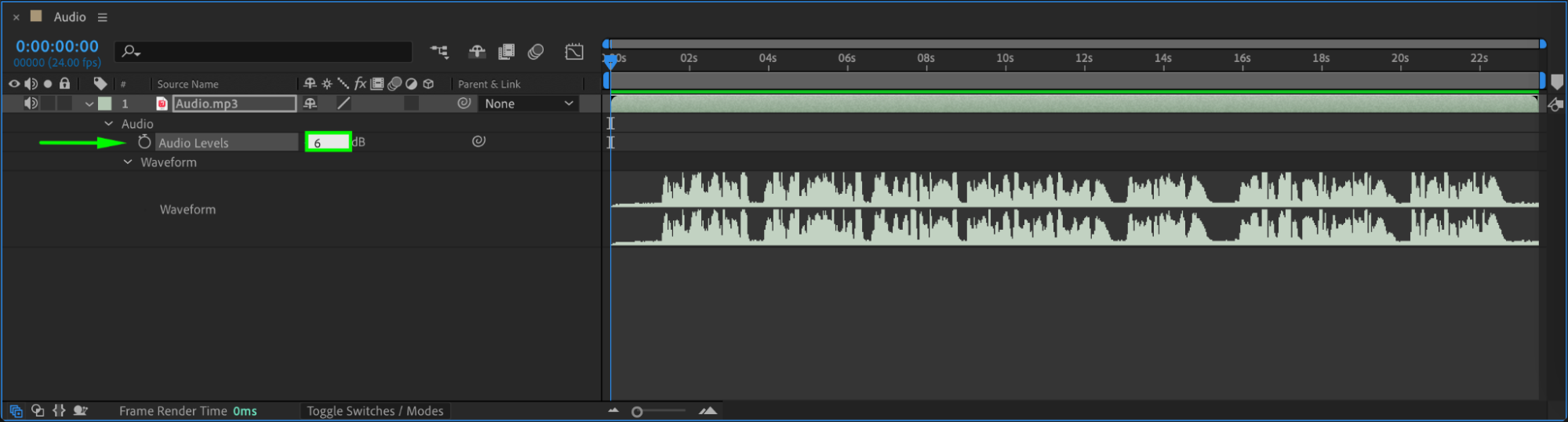 Select the audio layer and press “L” twice (LL) to quickly open the waveform. Use the Audio Levels property to increase or decrease the volume by adjusting the dB value.