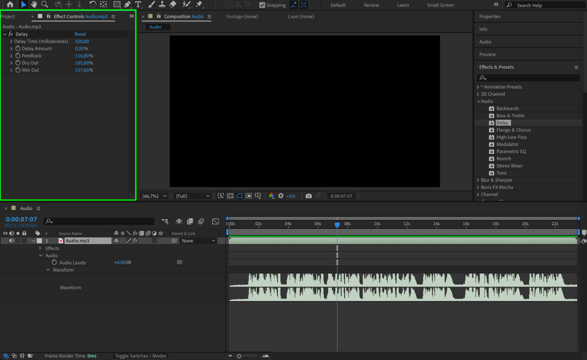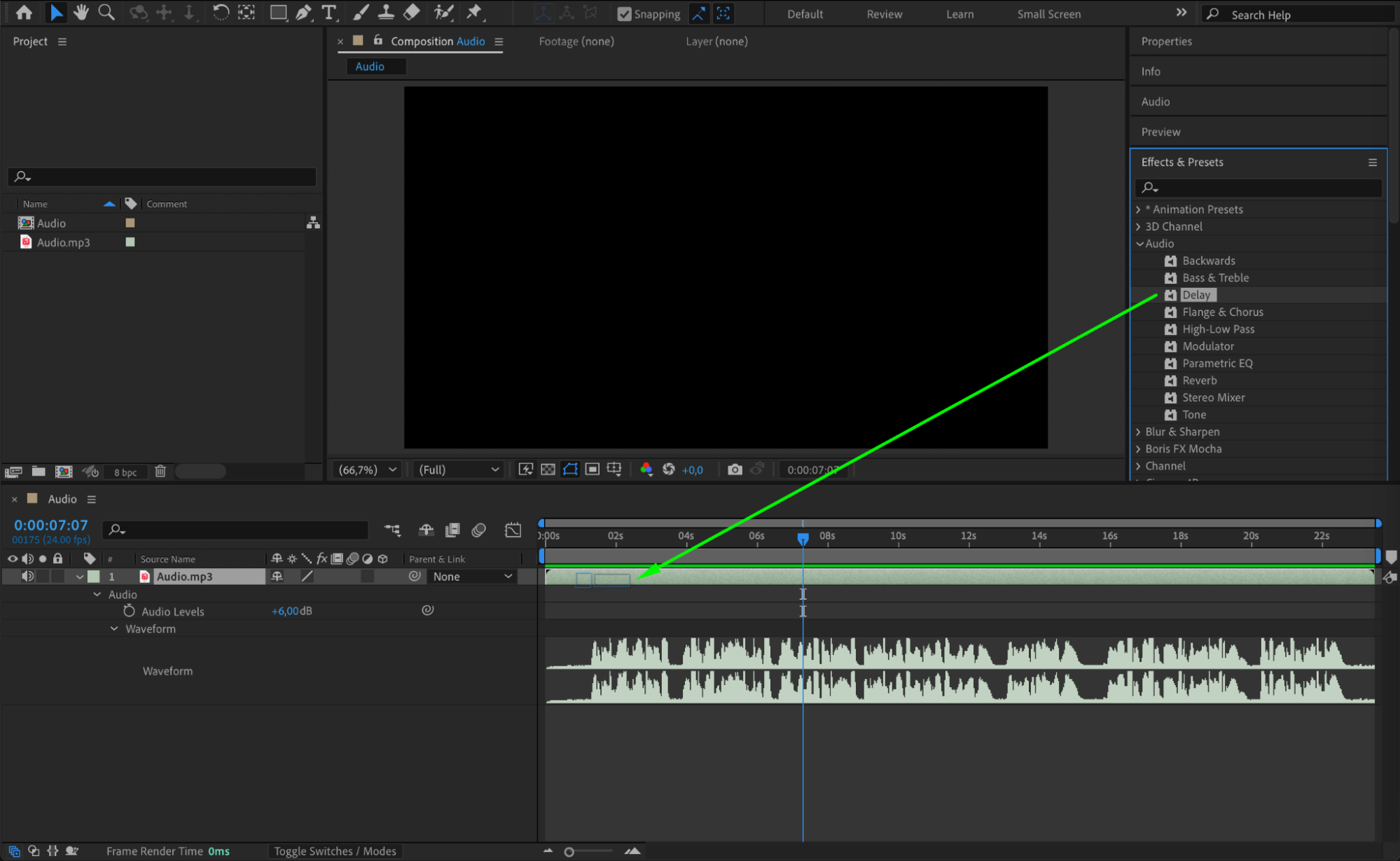 Open the Effects & Presets panel and search for audio effects such as Delay, Reverb, or Parametric EQ. Drag an effect onto the audio layer, then adjust its settings in the Effect Controls panel. These effects can modify the waveform by changing the sound’s delay, echo, or frequency balance.