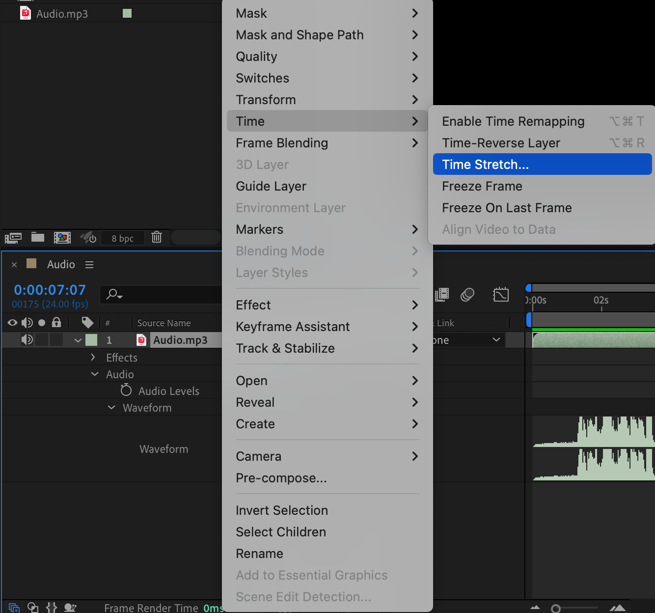 Right-click on the audio layer and select Time > Time Stretch. In the Time Stretch window, adjust the Stretch Factor – increasing it slows down the audio (expanding the waveform), while decreasing it speeds up the audio (compressing the waveform). This change alters how the waveform appears and how the audio plays back.