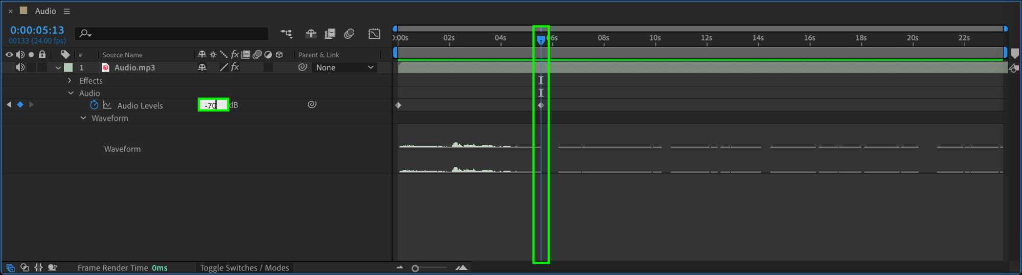 Click the drop-down arrow next to your audio layer to expand its properties. Open the Audio section, then click on Waveform to display the visual representation of the sound.
