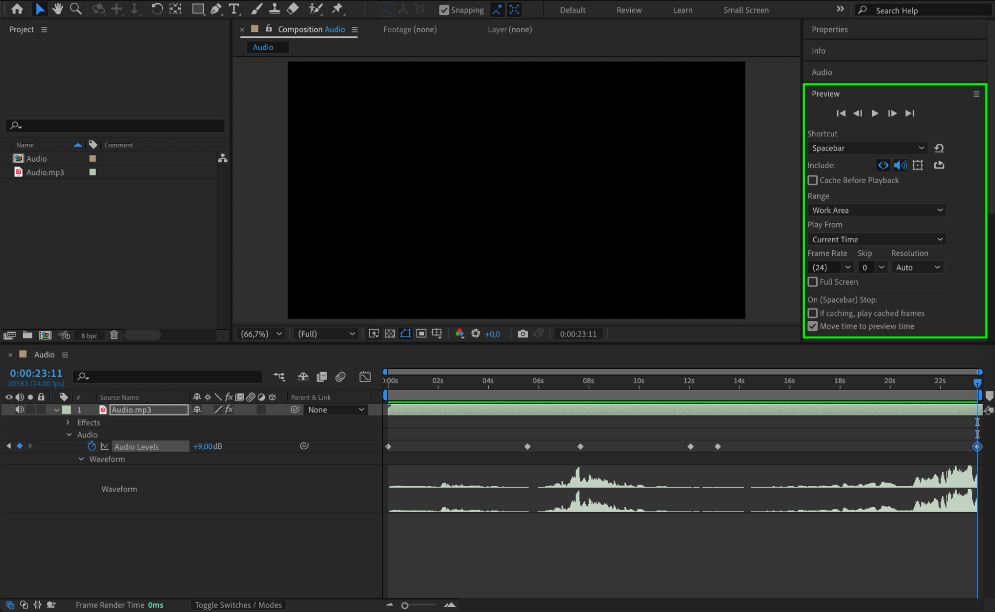 Press the Spacebar to play the composition and check how the waveform and audio sound after adjustments. Make further changes if necessary.