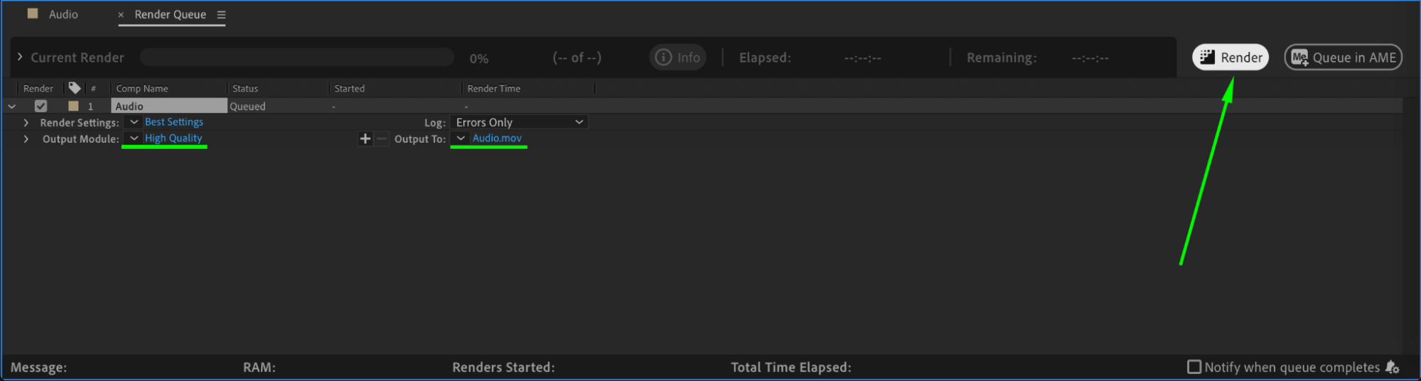Go to Composition > Add to Render Queue, choose the preferred format, set the output location, and click Render to export your project with the modified waveform.