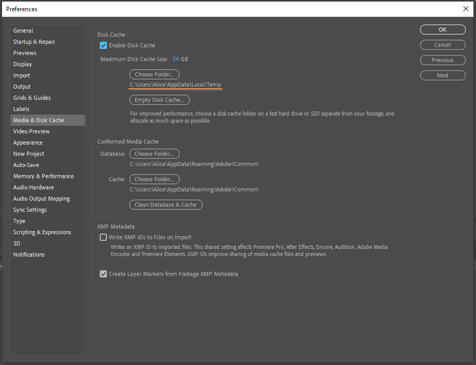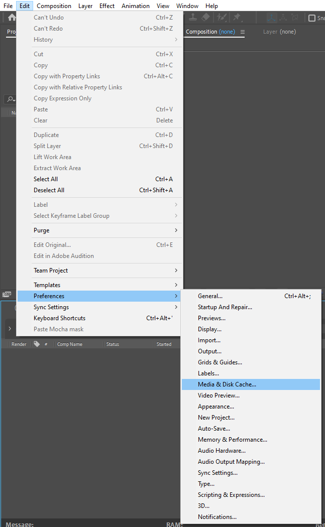 To begin, open After Effects and navigate to the “Edit” tab in the top menu. From there, click on “Preferences” and select “Media & Disk Cache.”