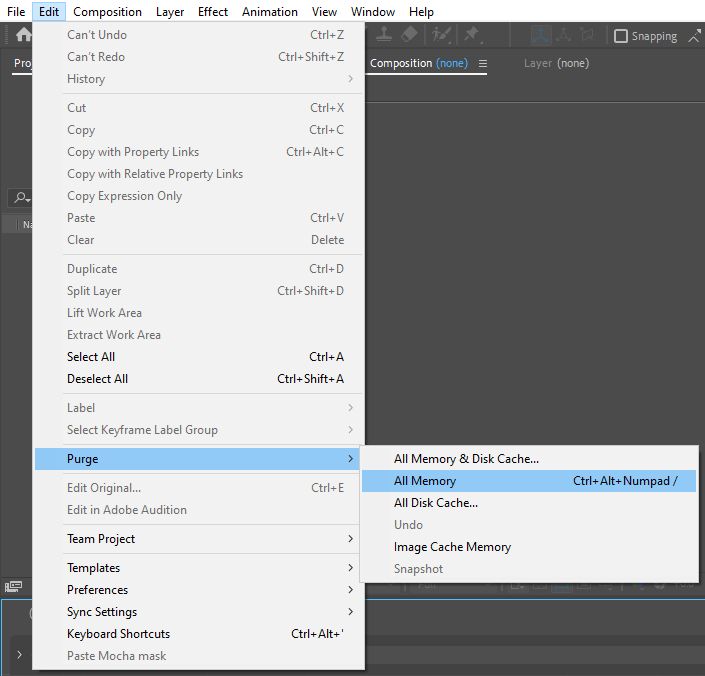 In addition to the disk cache, After Effects also has a RAM cache that stores frequently used data in your computer’s memory. To clear the RAM cache, simply go to Edit > Purge > All Memory or press “Ctrl + Alt + / (on numeric keypad)” (Windows) or “Shift + Command + Numpad / ” (Mac) while After Effects is open.