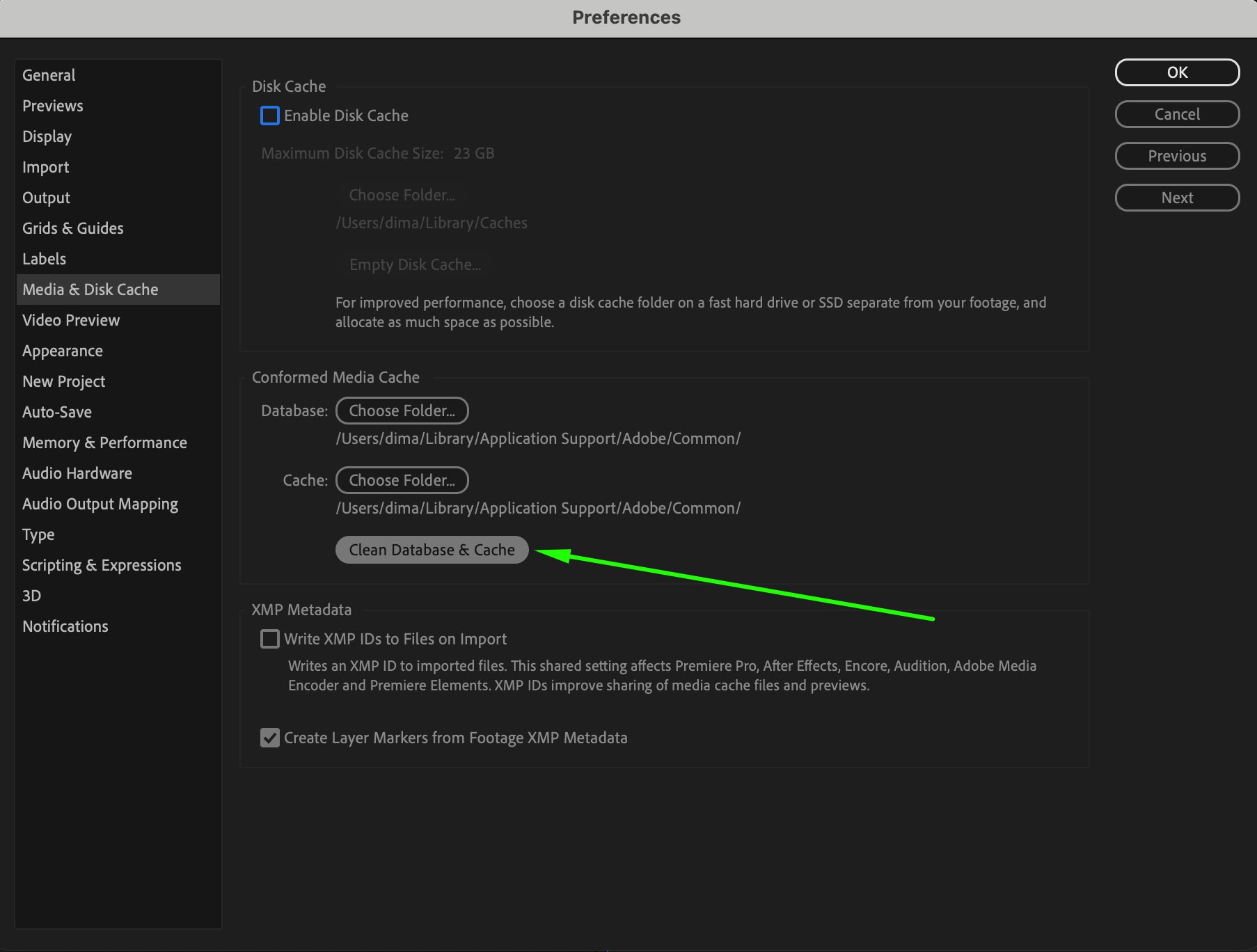 In the Media & Disk Cache preferences window, you’ll see a section called “Conformed Media Cache.” Underneath this section, there’s a button labeled “Clean Database & Cache.” Click on this button to start the process of clearing the Disk Cache.