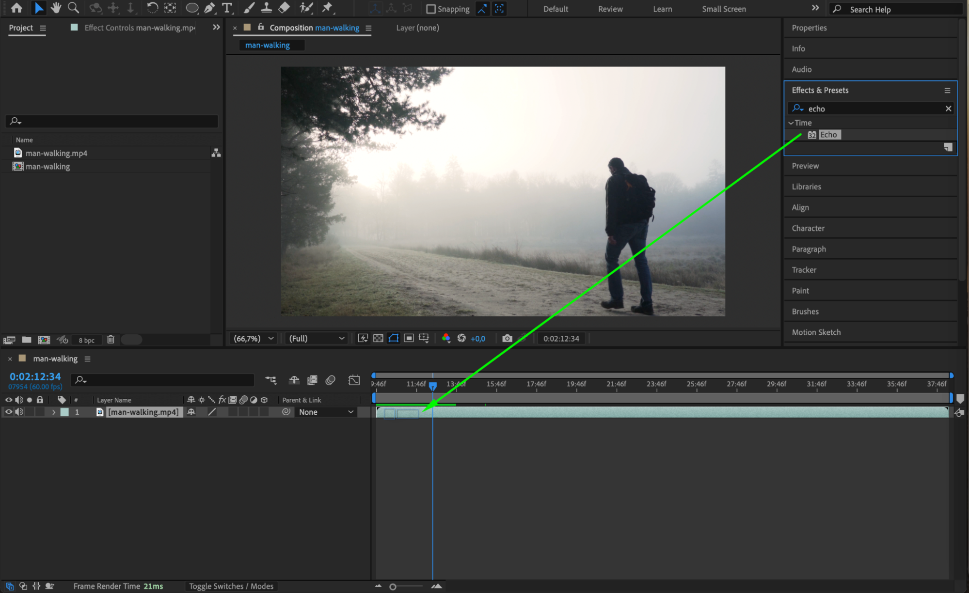Next, locate the Echo Effect in the Effects & Presets panel. Simply search for “Echo,” and drag it onto your video layer in the Timeline. The Echo effect will duplicate the image of you, creating the initial cloning effect.