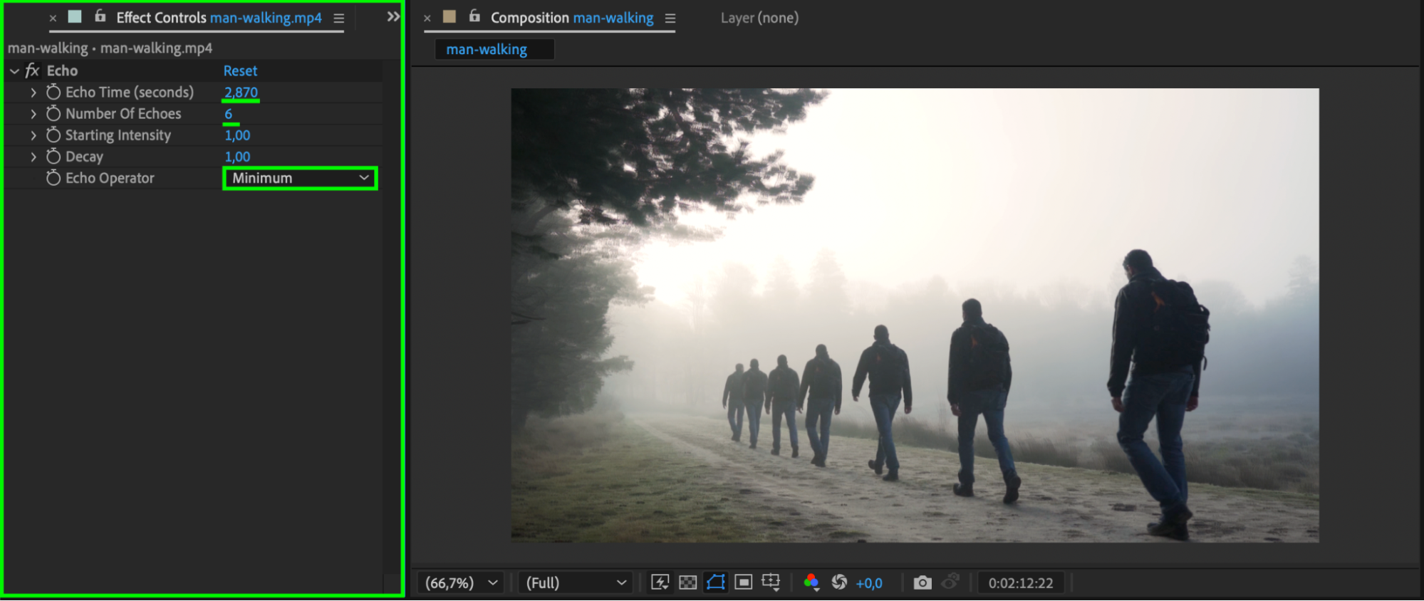 Echo Operator: Set to Minimum. This blends the cloned images with the original layer, helping to achieve a more seamless effect.