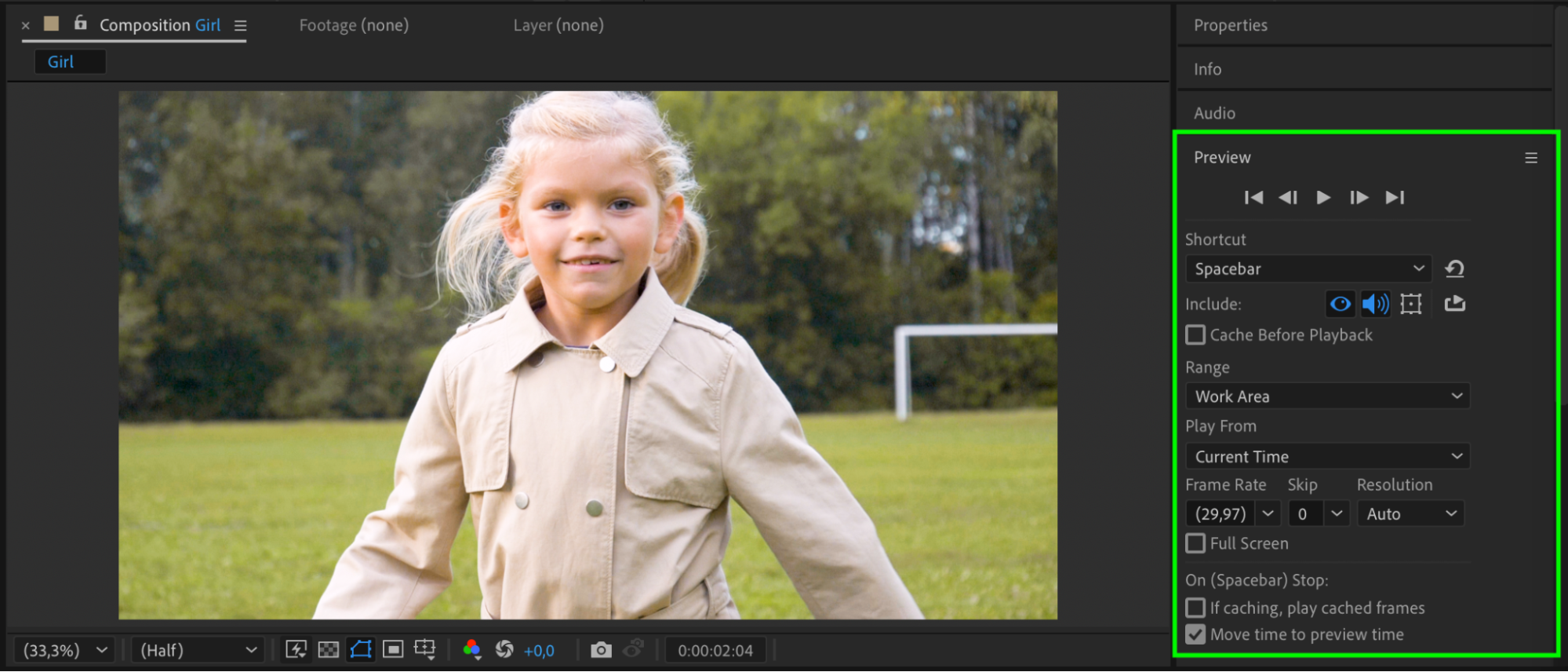 Press the Spacebar to play the composition and check how the color corrections appear in motion. Toggle the Effects switch to compare the original and corrected versions. Adjust settings if needed.