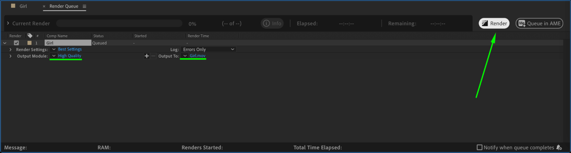 Go to Composition > Add to Render Queue, select the preferred format and output location, and click Render to export your color-corrected video.