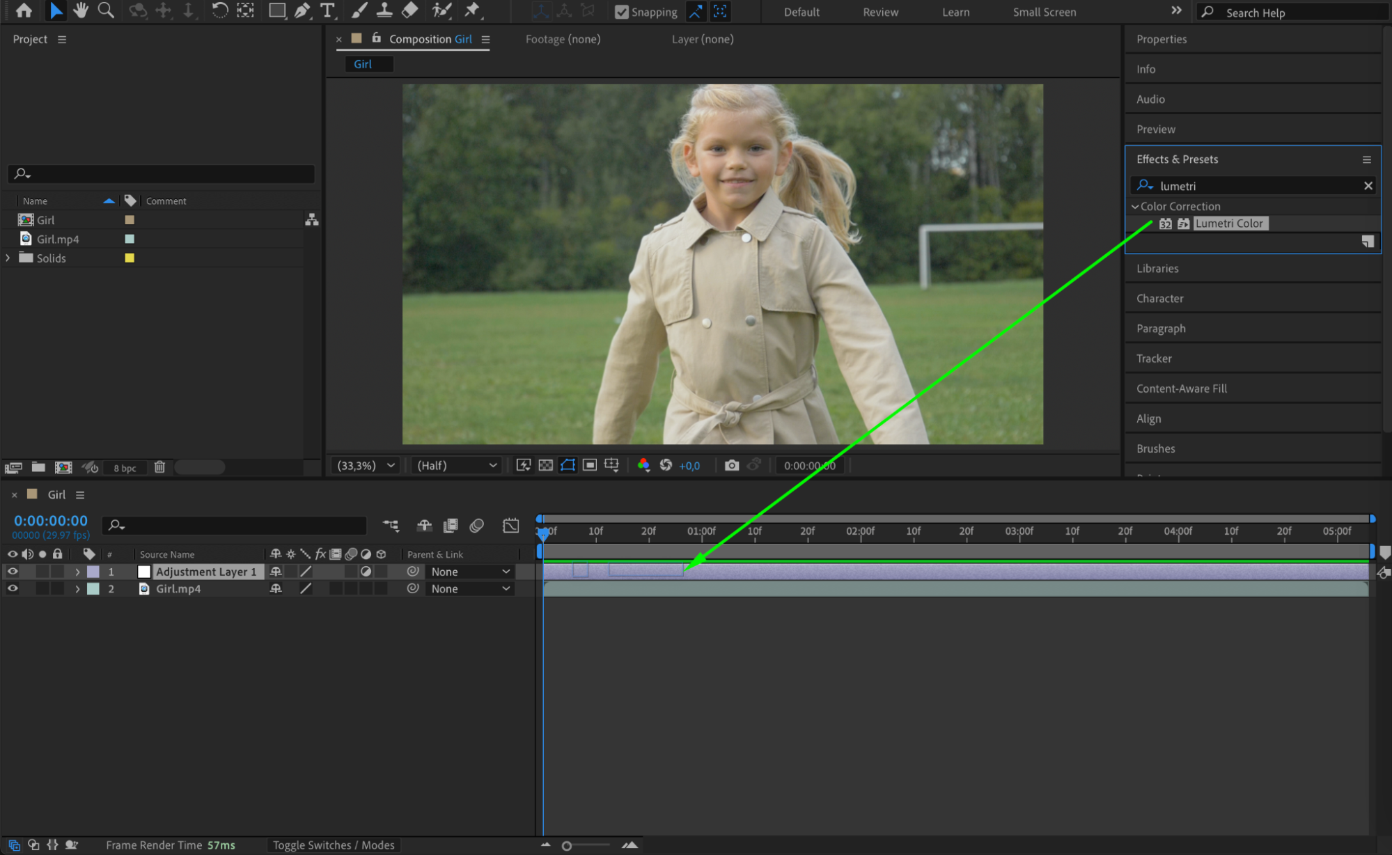 Open the Effects & Presets panel, search for Lumetri Color, and drag it onto the Adjustment Layer. This tool provides an all-in-one solution for color correction.