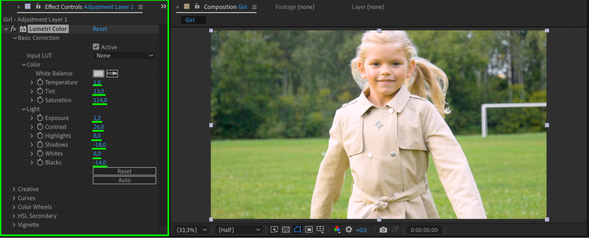 Press the Spacebar to play the composition and check how the color corrections appear in motion. Toggle the Effects switch to compare the original and corrected versions. Adjust settings if needed.