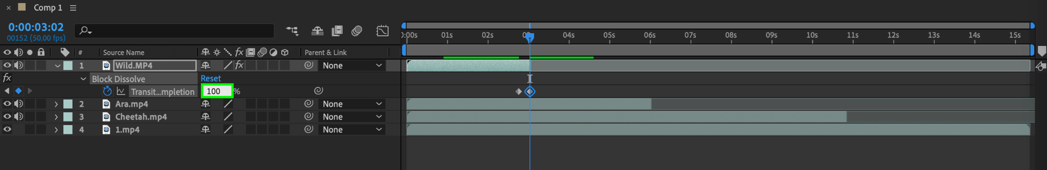 To resize your videos, select the video layer and press the “S” key to open the scale parameter for the chosen layer. Enter the desired value to adjust the size of the video.
