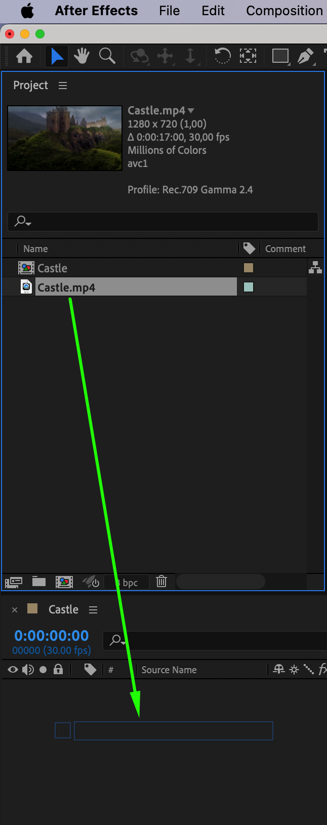 Next, locate your video file in the Project panel and drag it onto the timeline panel. This action will create a new layer with your video.