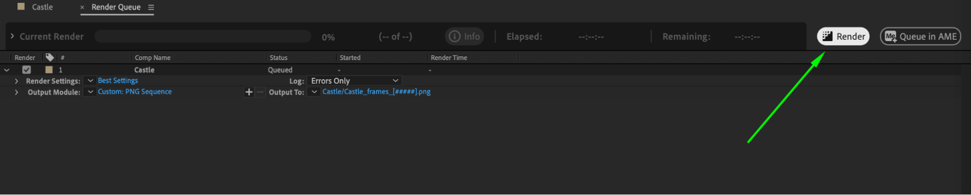 To choose the specific range of frames you want to extract, move the playhead to the starting point on the composition timeline. Use the Current Time Indicator and shortcuts “Alt/Option + [“ and “Alt/Option + ]” to set the beginning and end of the segment you want to convert into an image sequence. This will determine the range of frames you want to export.