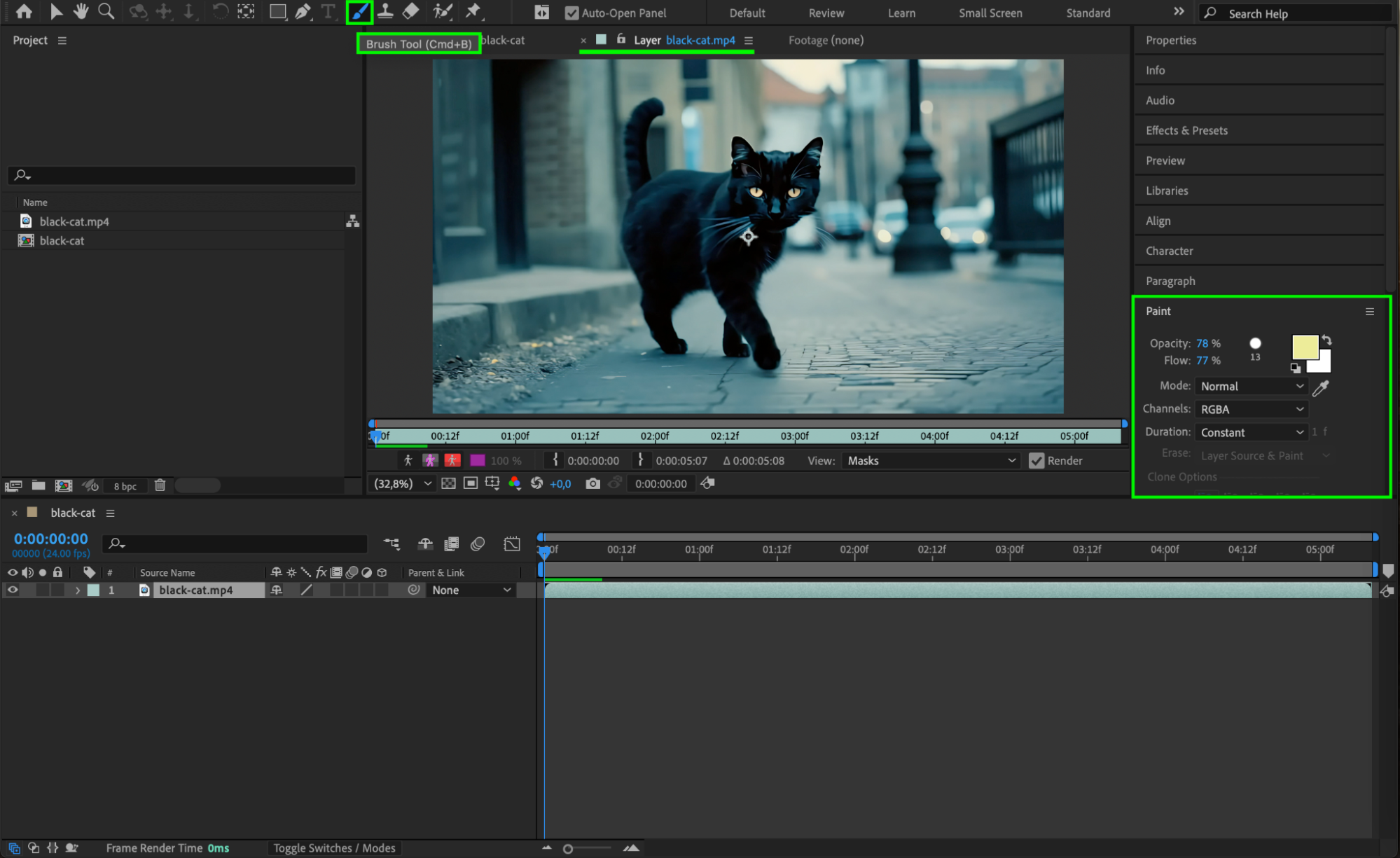 Begin by selecting the Brush Tool from the toolbar or by pressing “Ctrl/Cmd + B”. Ensure you’re working in a Layer Panel (not the Composition Panel), as the brush tool is only active in the Layer view. Open the layer where you want to create or edit brush strokes.