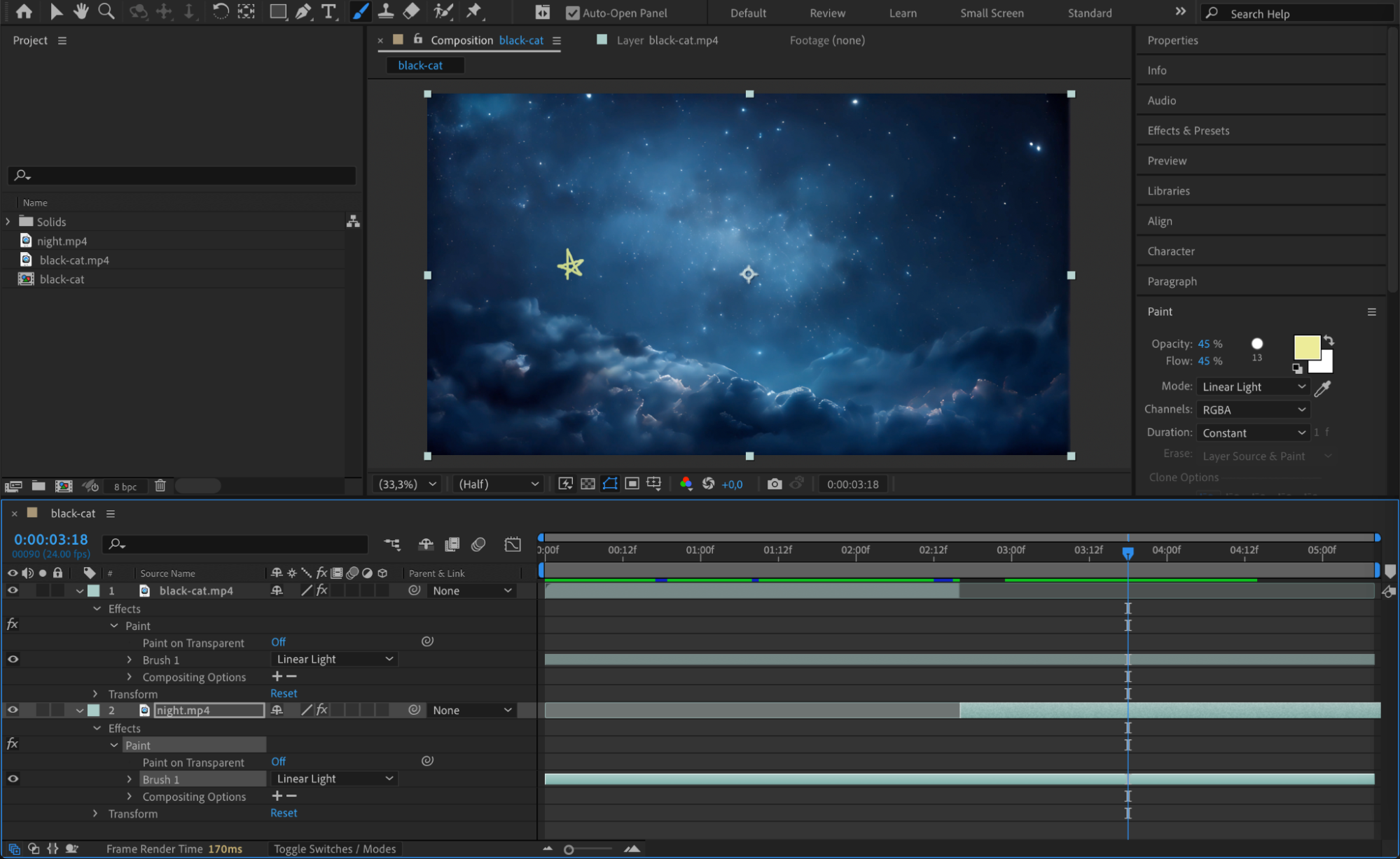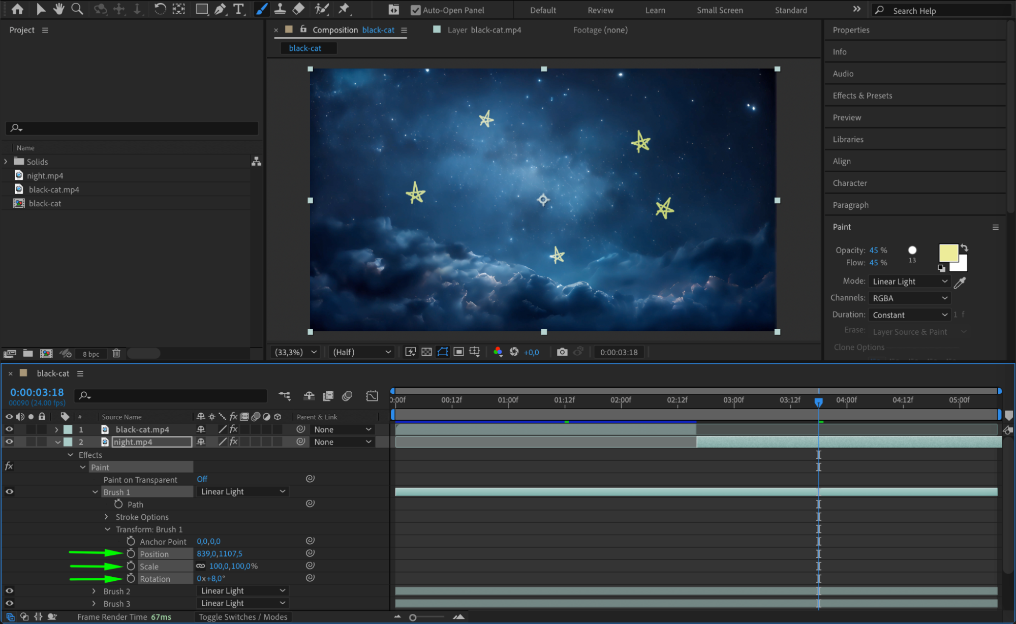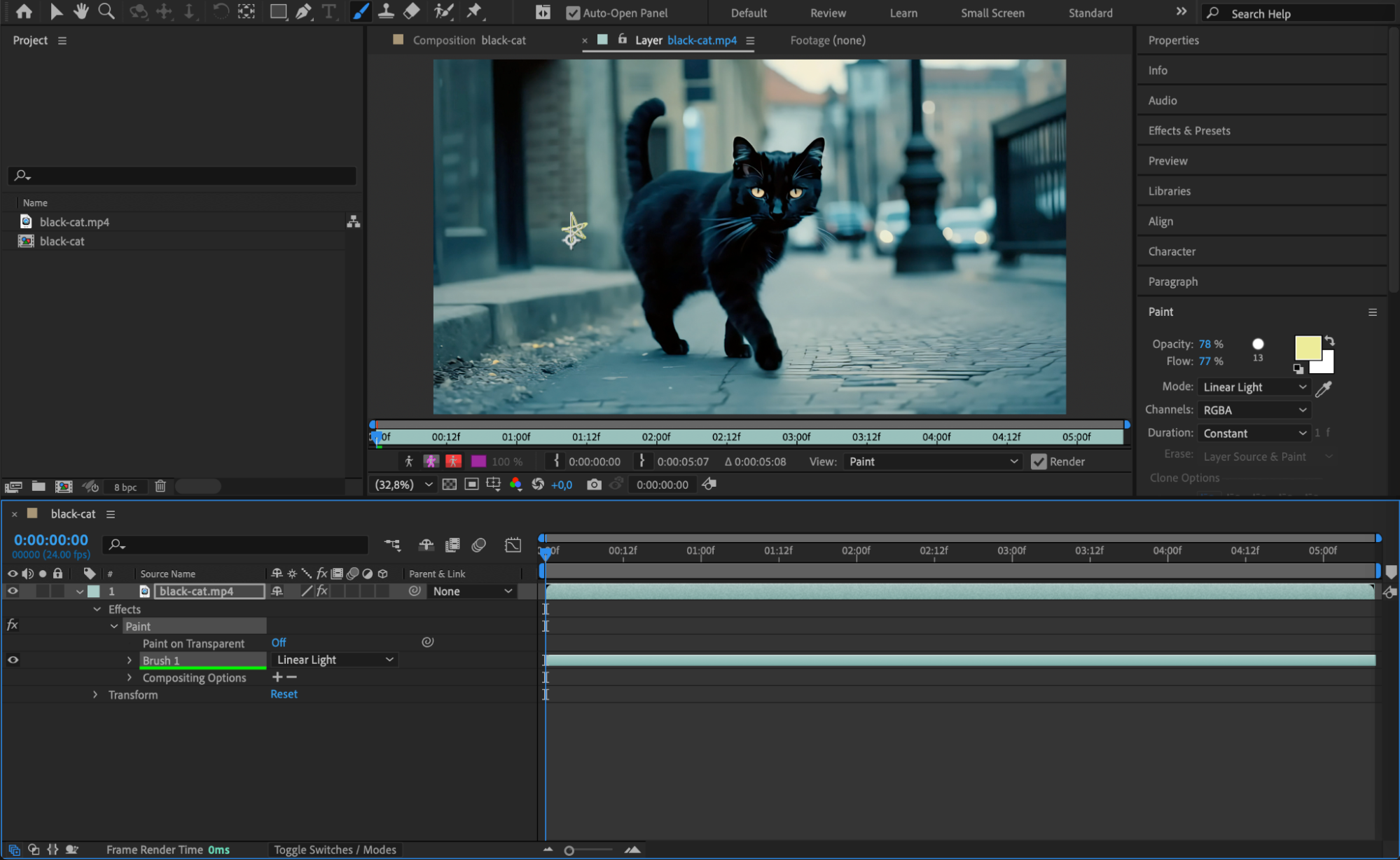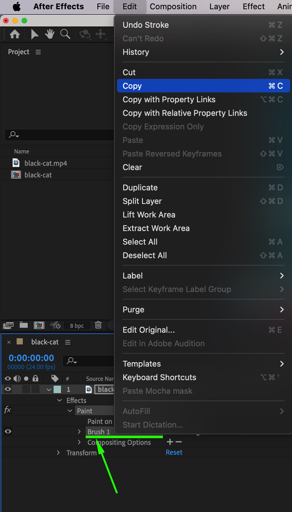 To copy brush strokes, you need to select them first. In the Timeline Panel, expand the layer’s properties by clicking the arrow next to the layer name. Navigate to Effects > Paint, where your brush strokes will be listed as individual entries. Select the strokes you want to copy by clicking on them. With the desired strokes selected, press “Ctrl/Cmd + C” to copy them. The strokes and their associated properties, such as timing and color, are now stored in the clipboard.