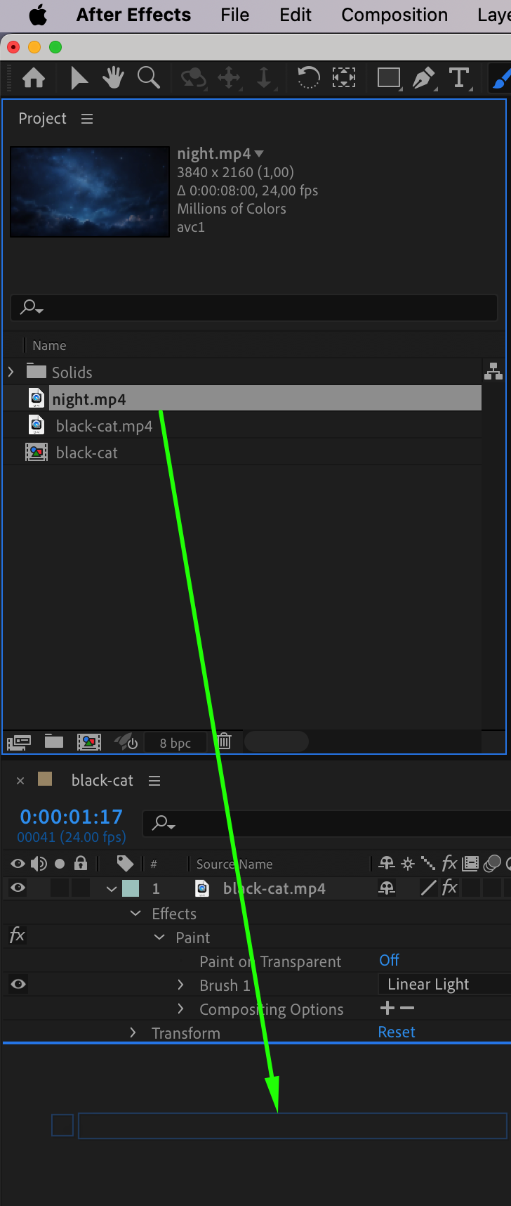 To paste the brush strokes onto another layer, select the target layer and ensure you are in the Layer Panel. Move the CTI (Current Time Indicator) to the position where you want the strokes to appear, then press “Ctrl/Cmd + V”.